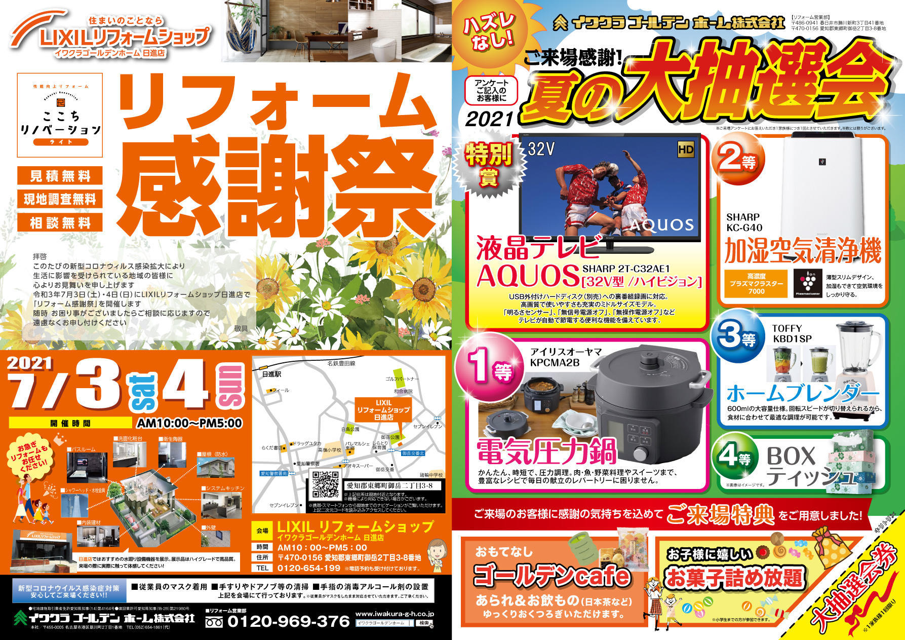 来る、令和3年7月3日(土)4日(日)の2日間『リフォーム感謝祭』を開催いたします。