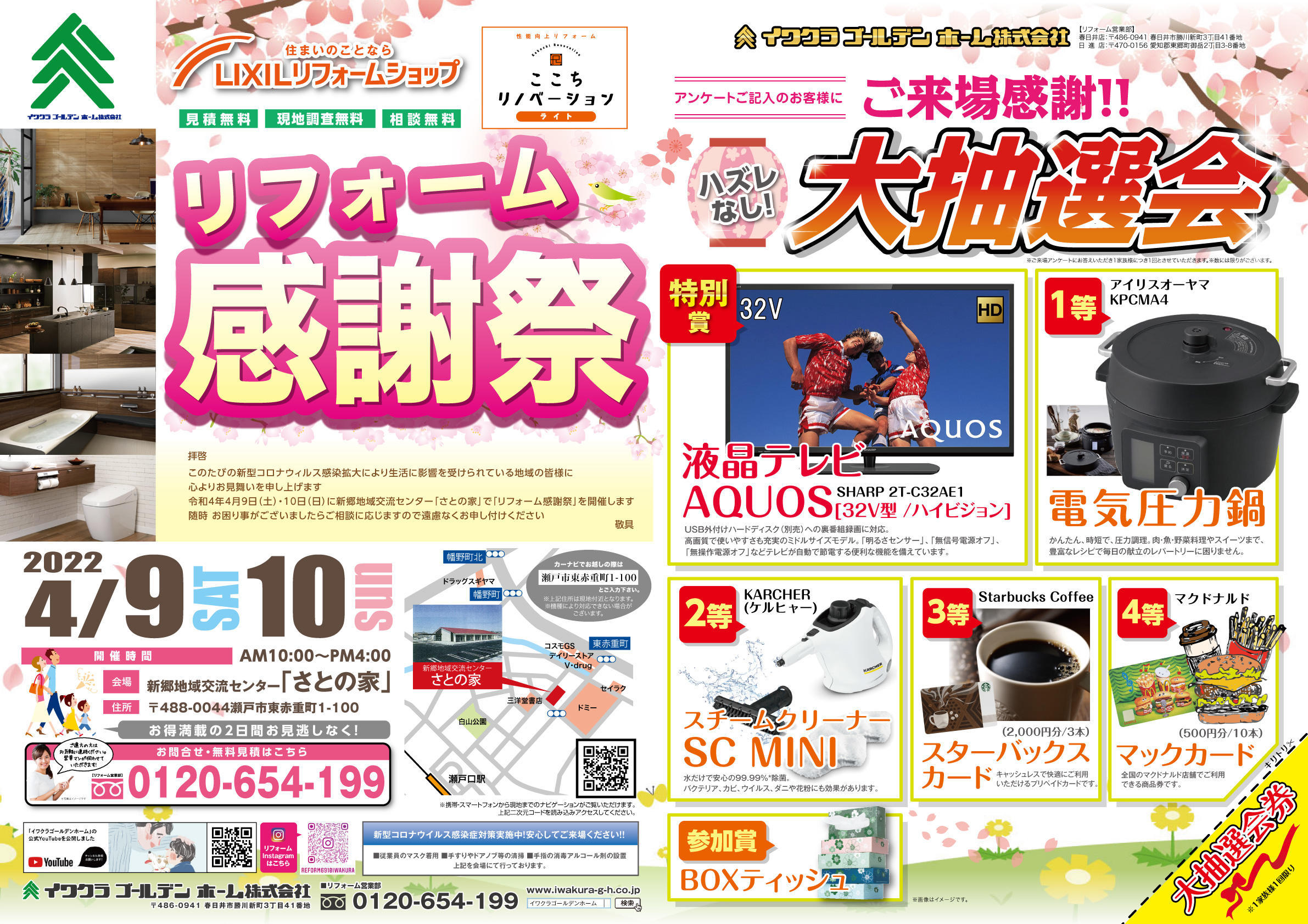 来る、令和4年4月9日(土)10日(日)の2日間『リフォーム感謝祭』を開催いたします。