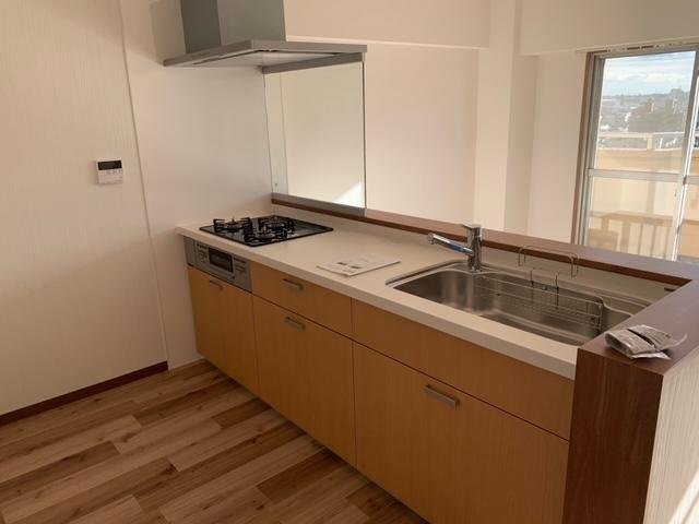 縦長11畳のLDKを16畳の広々リビングに変更し、壁付けキッチンを対面キッチンにしました。