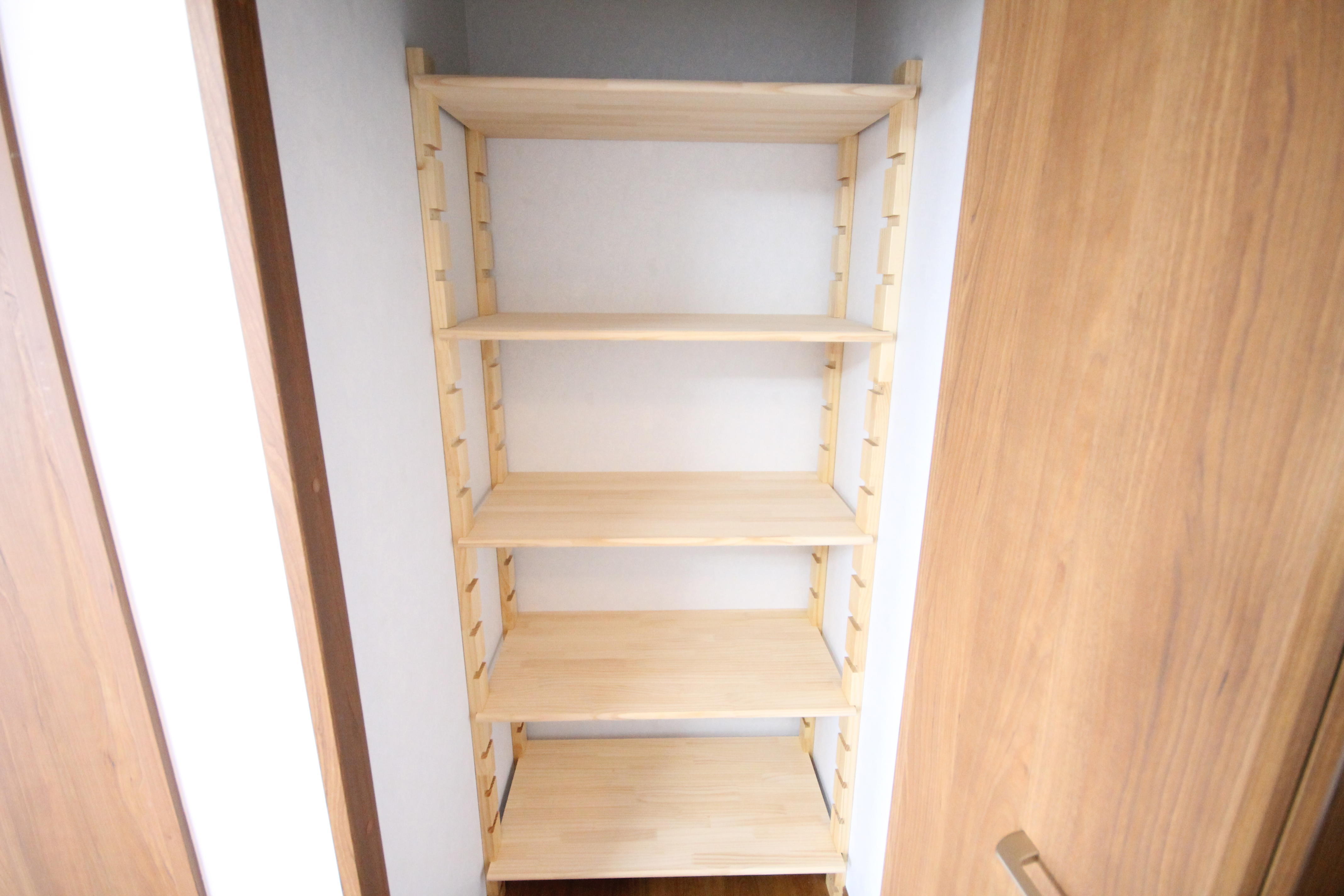 キッチンの吊戸棚を無くしたので、キッチンの横に新しく収納スペースを作り、収納力もバッチリです!