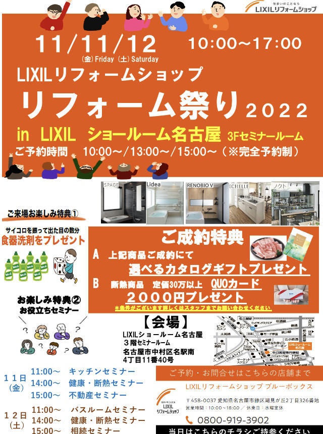 年間1万組以上が来場されるLIXILショールーム名古屋にて、LIXILリフォームショップ リフォーム祭り2022を開催いたします。