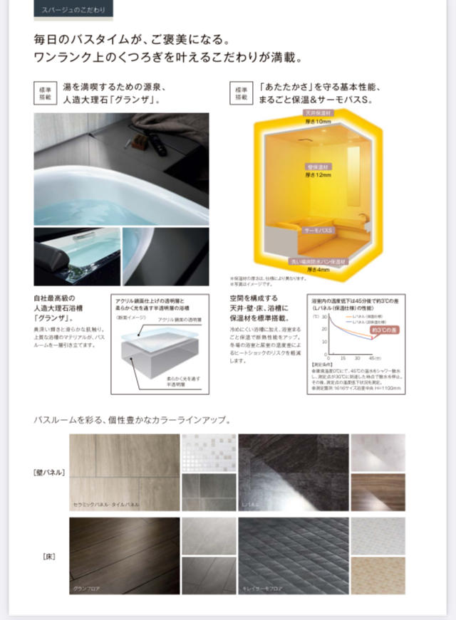 スパージュBXスタートプランは『最高級アクリル人造大理石』(LIXIL社最高級グレード)『あったかさを守る基本性能まるごと保温』&『サーモバスS』が標準装備!!(アクアフィールはオプション)