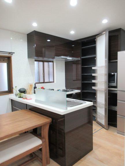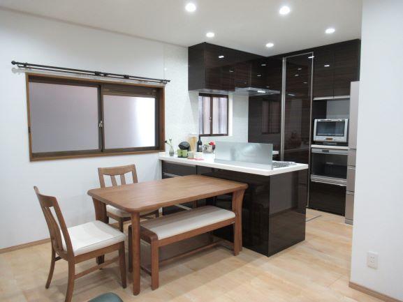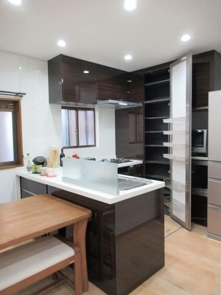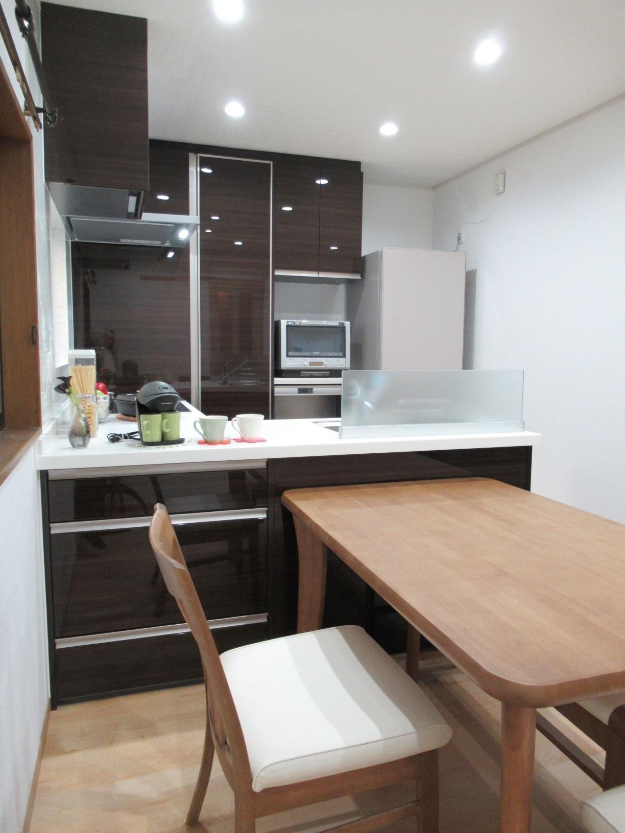 キッチンの濃い木目柄が映えるように、