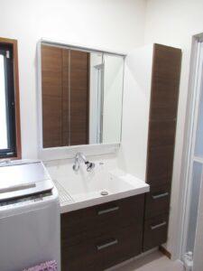 洗面台の扉色をキッチンの収納部の色に合わせることにより、家全体のカラーイメージをまとめ、落ち着いた仕上がりとなりました。