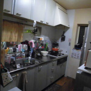 対面式キッチンを囲っていた壁を取り、壁付けのL型キッチンを配置し、リビングに続く和室を洋室に改装。