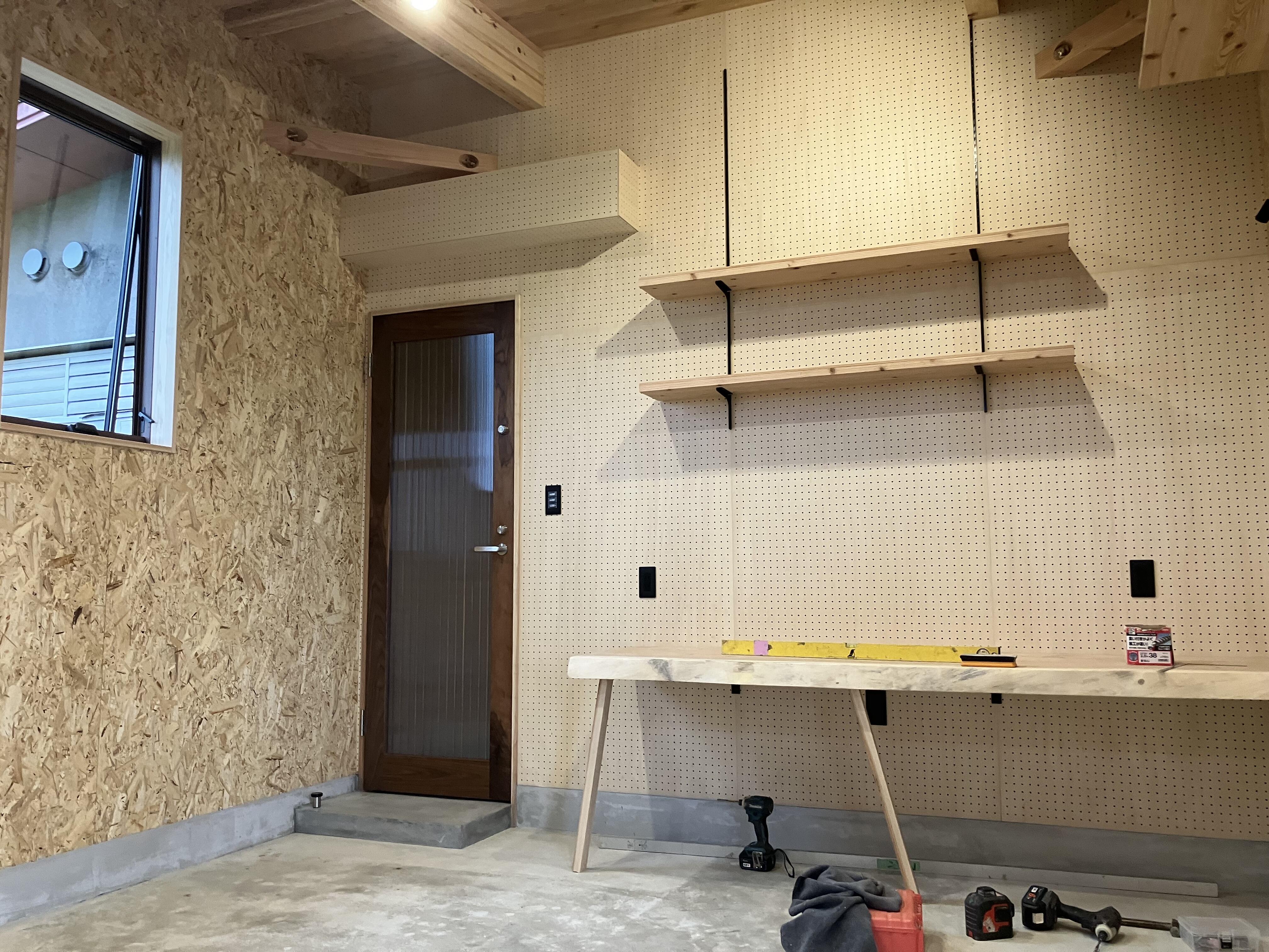 今回の材料選定はお客様の要望で木の風合いが出て、作業台ということで