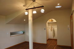 T様邸では、寝室を北側に設けることになりました。 ほとんど夜間しかいらっしゃらないとのことでしたが、 日中も明るい光が差し込むように、天井に『スカイライトチューブ』を 取り付けることにいたしました。 集光能力が高いため、自然光を効率的に取り込めます。 また、トイレや洗面脱衣室にアクセント壁を設けたり、ニッチや飾り棚を造ったり、 遊び心のある空間をつくらせていただきました。