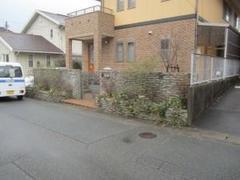 擁壁に囲まれた前庭をオープンな車庫スペースにリニューアルして、2台分の広さを確保しました。門廻りはレンガ積みにして、シックに仕上げています。