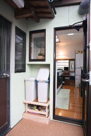 キッチンのレイアウトを変更することにより、勝手口を作ることができました。勝手口の向こうは、ストックヤードです。ストックヤードは床を組むことで、家事室になりました。キッチンから家事室洗面脱衣所と、家事動線がとても良くなりました。