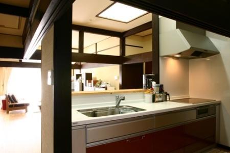 システムキッチンはNational GENEO。べんがら→柿渋+鉄粉で塗装しなおした梁の色としっくりなじむよう、落ち着いたレッドをセレクトしました。