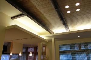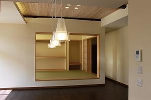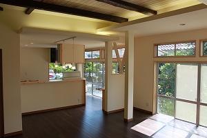 壁や建具で仕切られた空間を 開放的にリフォームさせていただきました。床はウォールナット塗装された無垢のフロア。壁は断熱塗料ガイナを塗装しています。天井はリビング側は以前より少し高くし、逆にダイニングキッチン側は変化をつけるため 低めにレイアウトしました。間接照明を取り入れ 日が暮れると昼間とは少し違う癒しの雰囲気ある空間が演出されます。