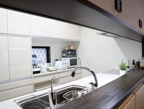 反射の効果を狙いキッチンの扉は全てホワイトで、同様に壁面の一面もツヤのあるホワイトのキッチンパネルを貼りました。