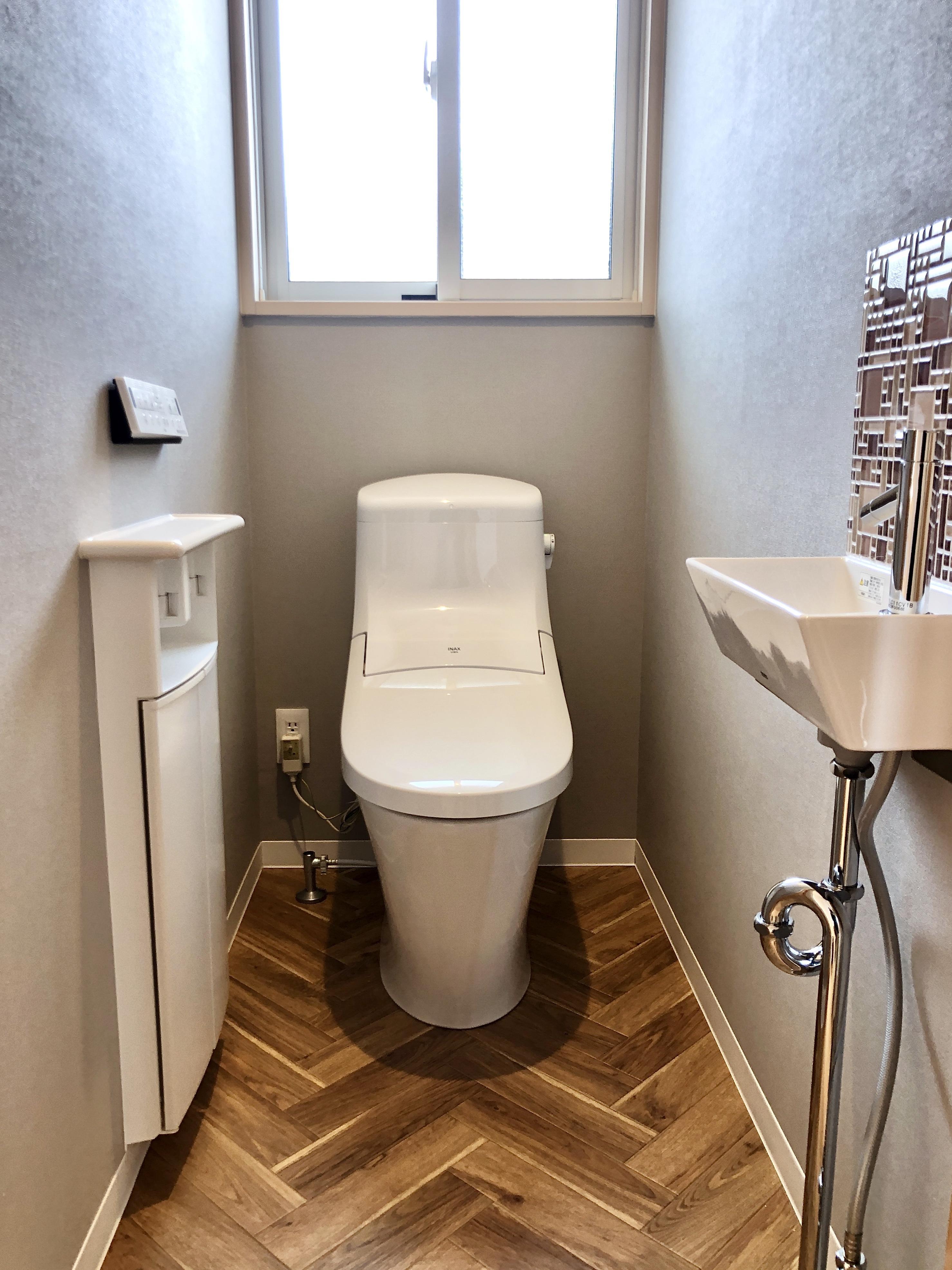 便器はLIXILのアメージュZAシャワートイレを採用。 お掃除しやすい機能が充実していますので、常に清潔感を保てます。 ヘリンボーンの床が良く映える、明るくおしゃれなトイレになりました。