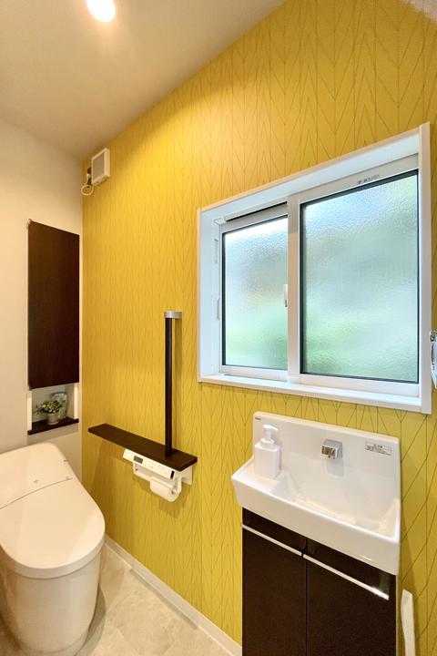 収納や手洗い、手すりを備えた、機能的なトイレにリフォームしました。 トイレはプレアスLS、手洗い器にはコフレルを採用。 背面には埋込収納棚を設置し、すっきりと収納。 イエローがアクセントの明るい印象のトイレになりました。