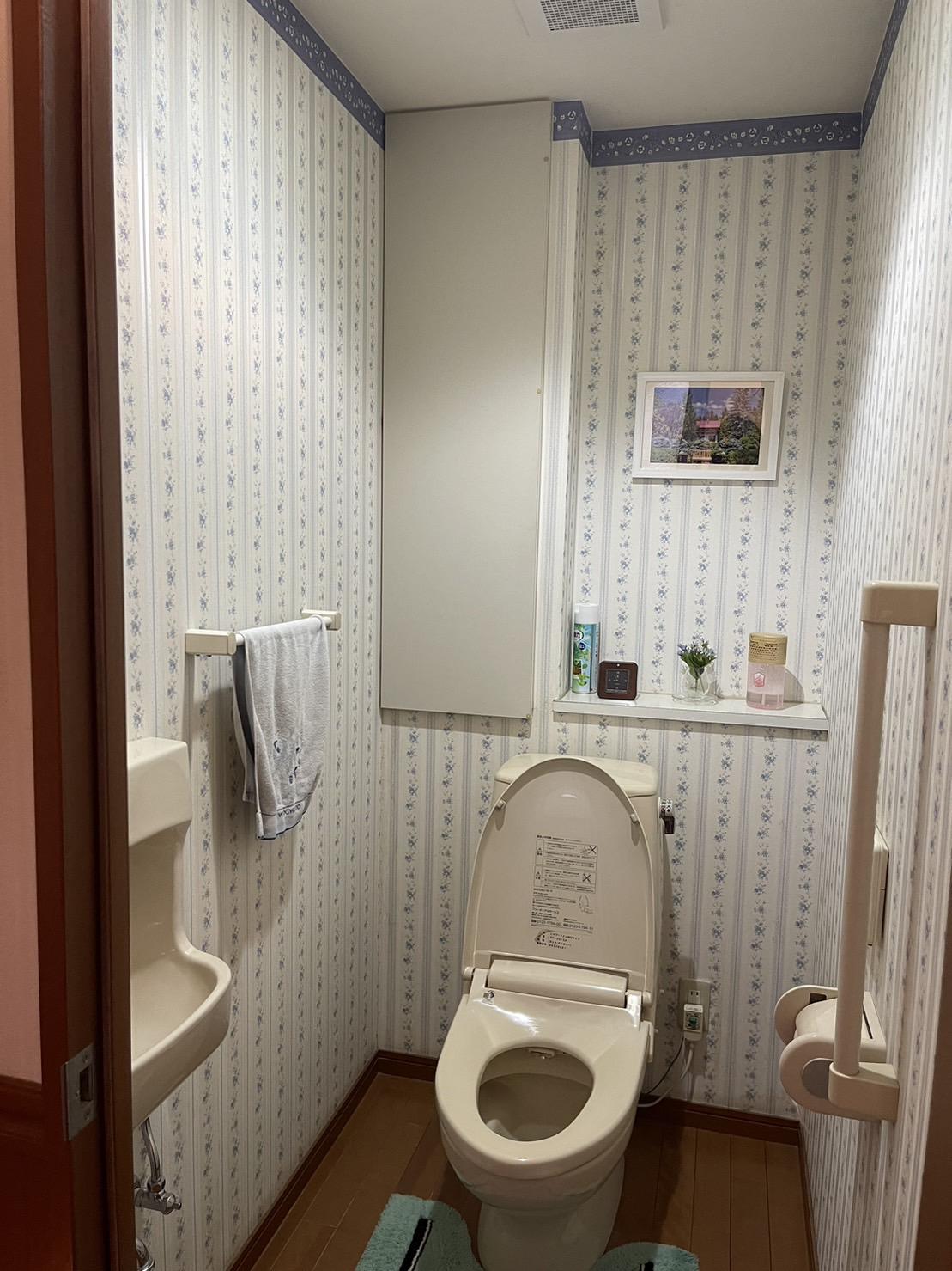 お客様こだわりのトイレリフォーム。 トイレの壁紙にはダマスク柄のクロスを選ばれました。 色の調和も良く、とてもエレガントな仕上がりになりました。