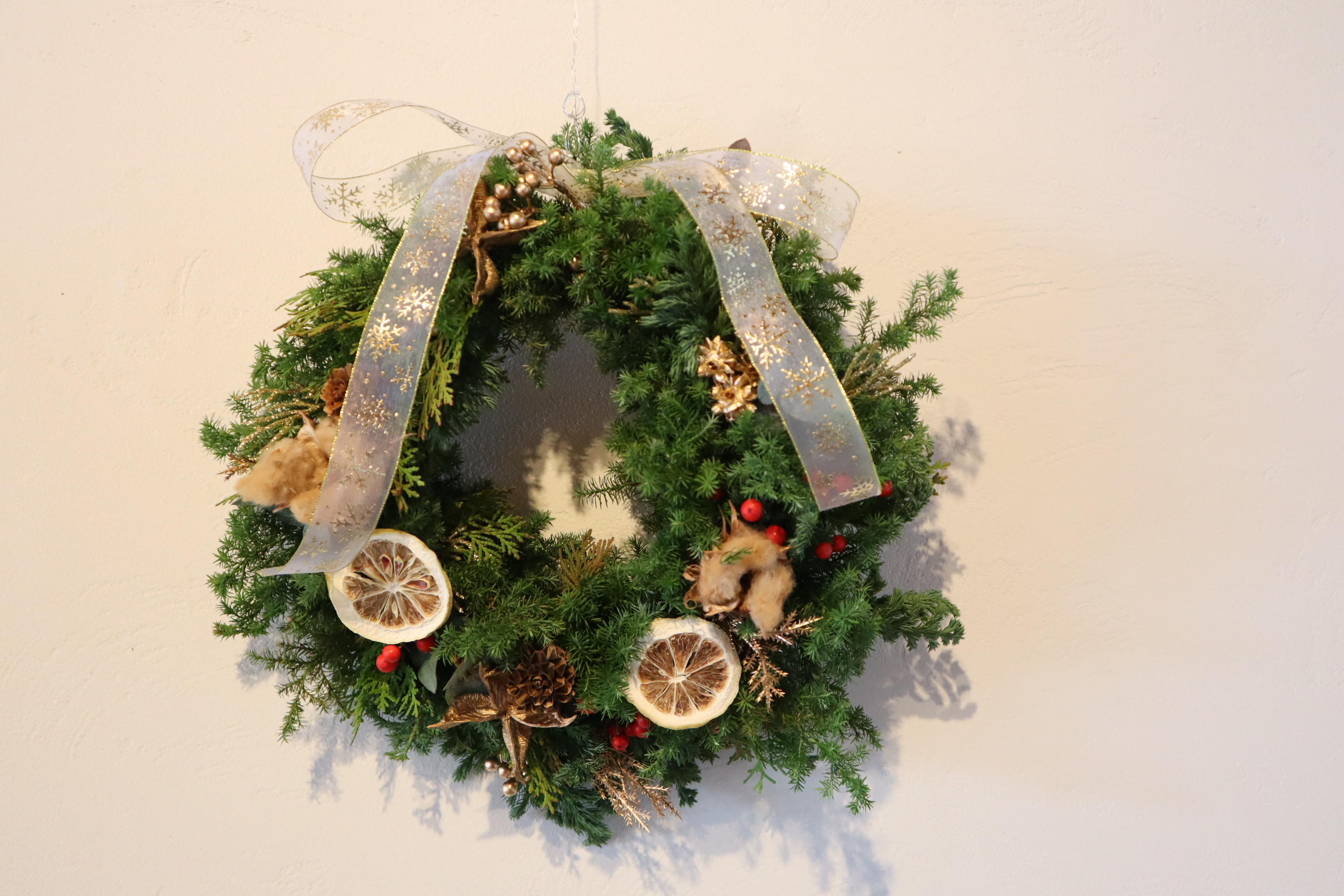 生花でクリスマスリースを作りましたが、持ちは3ヵ月ぐらい持ちます。