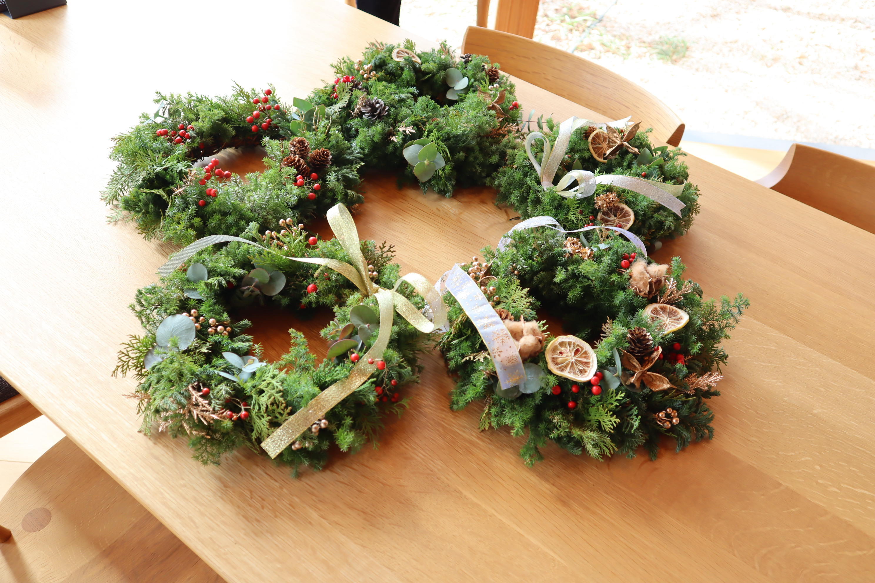 同じ材料でも飾付けや、葉の取付け方によってオリジナルのリースが出来上がりました!