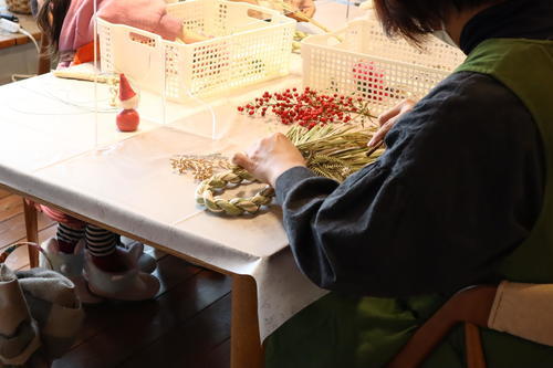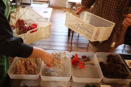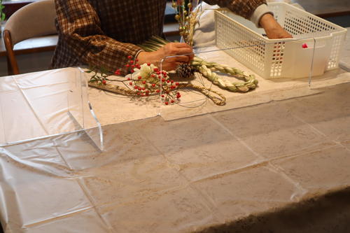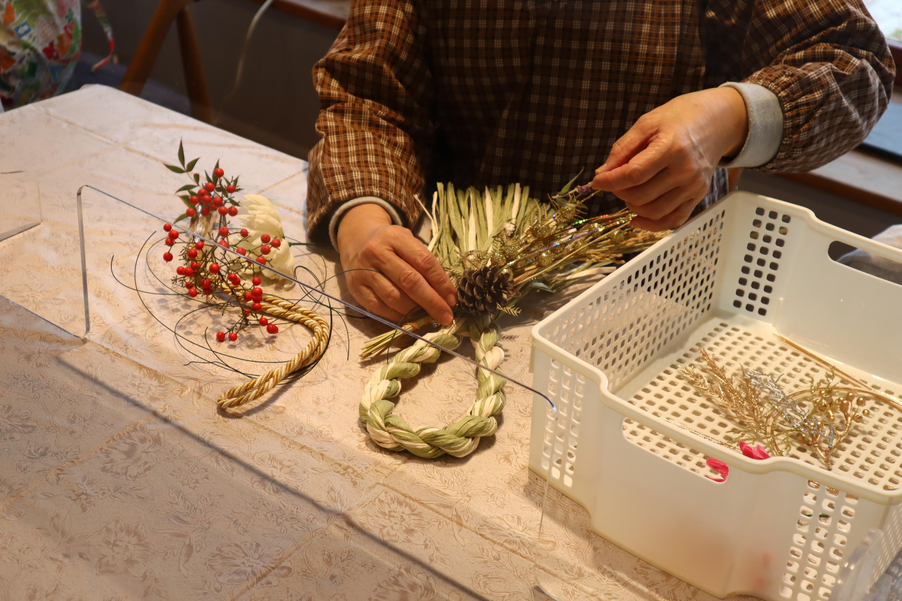 先ほど選んでいただいたものを、しめ縄に取付けていきます!