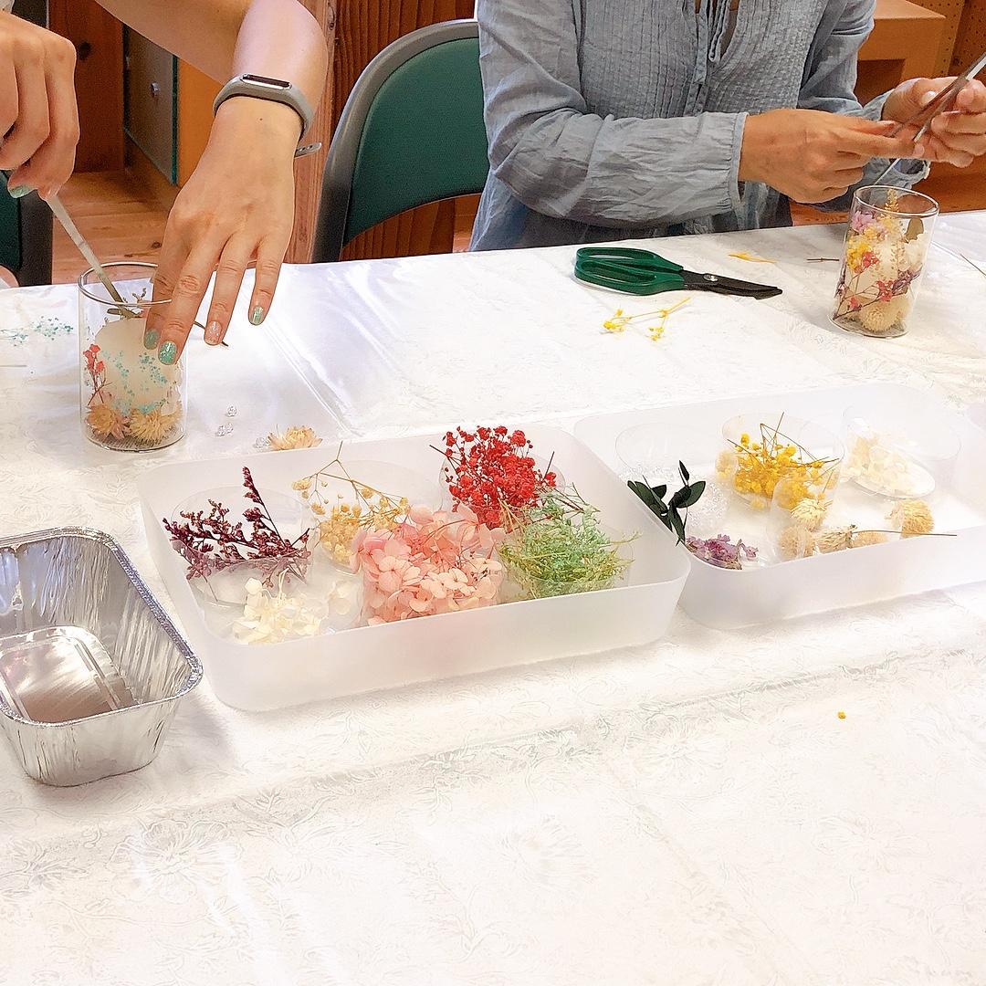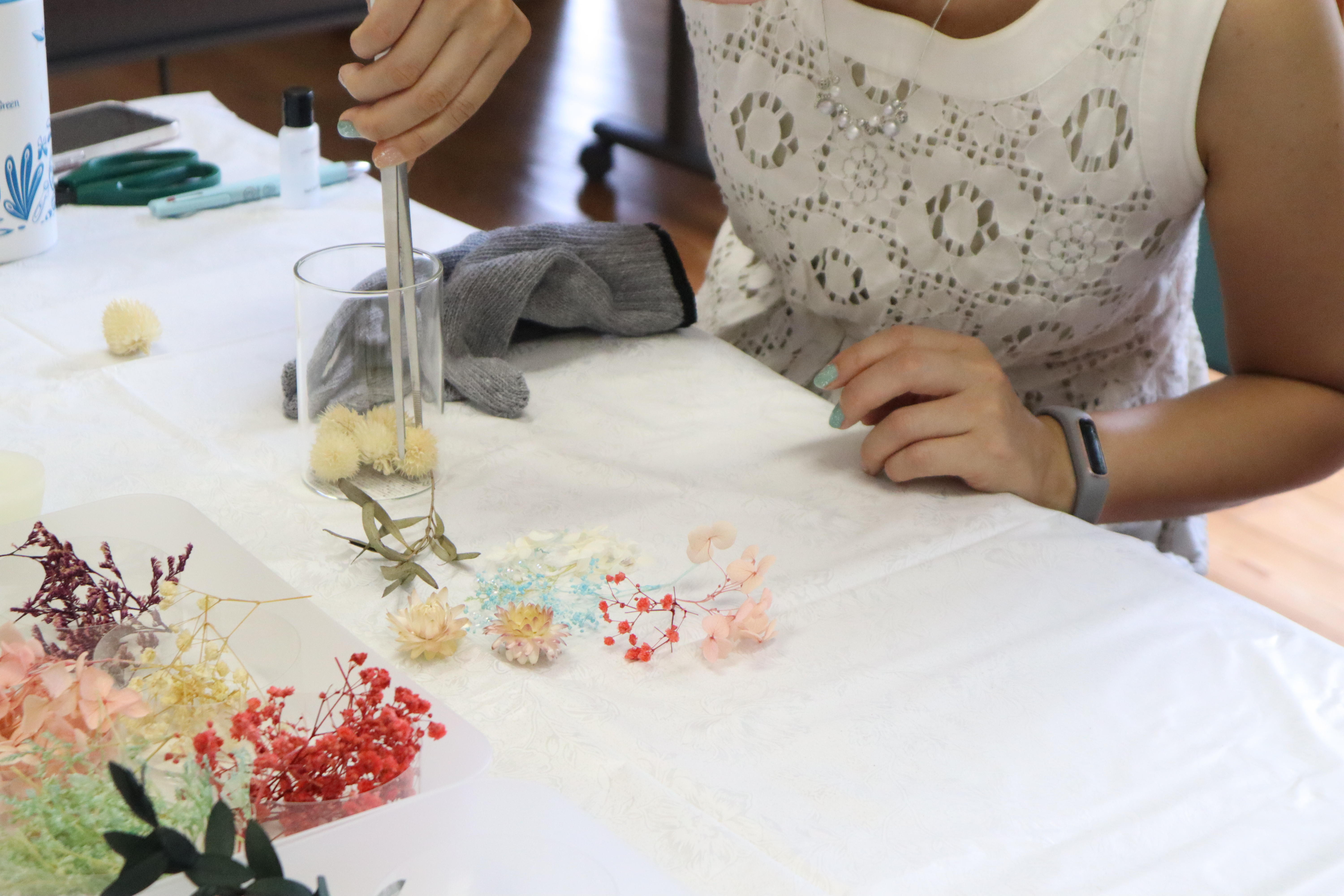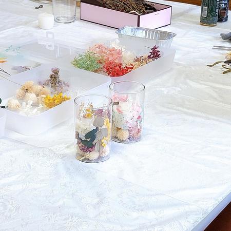 お好みのドライフラワーや天然素材をの草花を選んで容器に詰めます。
