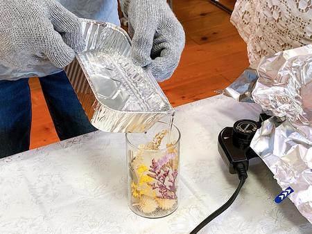 配置が決まったら、溶かしたワックスを流し込んで閉じ込めます。