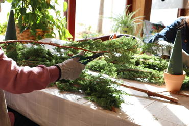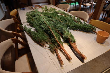 まずは、大きなサツマスギを切っていきます。エバーグリーンを重ねて角度やバランスを考えながらオアシスにさしていきます。