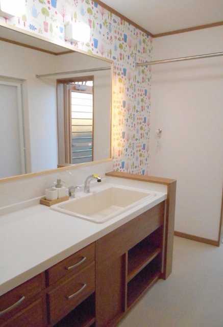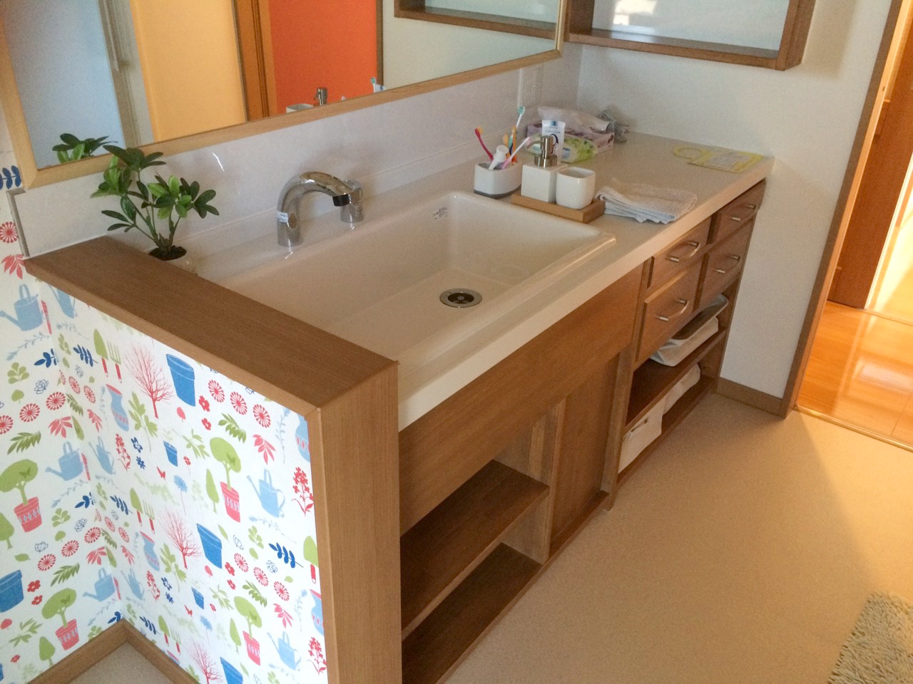 リフォーム前のお悩み・リフォームのきっかけは、「洗面室が暗く、寒さにも悩まれていました。また、新しくするなら造作の洗面化粧台にしてみたいという想いもありました。」と、(I様)。弊社としてリフォームのポイントは、横に並んでも使えるようにカウンターも鏡も横に広いタイプの洗面化粧台としました。また、シャワー水栓にしたり、奥様好みの可愛らしい壁紙に張替ました。洗面下にはオープンなニッチを作成することで、いろんな収納の仕方できる小物収納として利用できるようにするなど使い勝手も考えました。下地からすべて工事し、断熱工事もしっかり行っています。