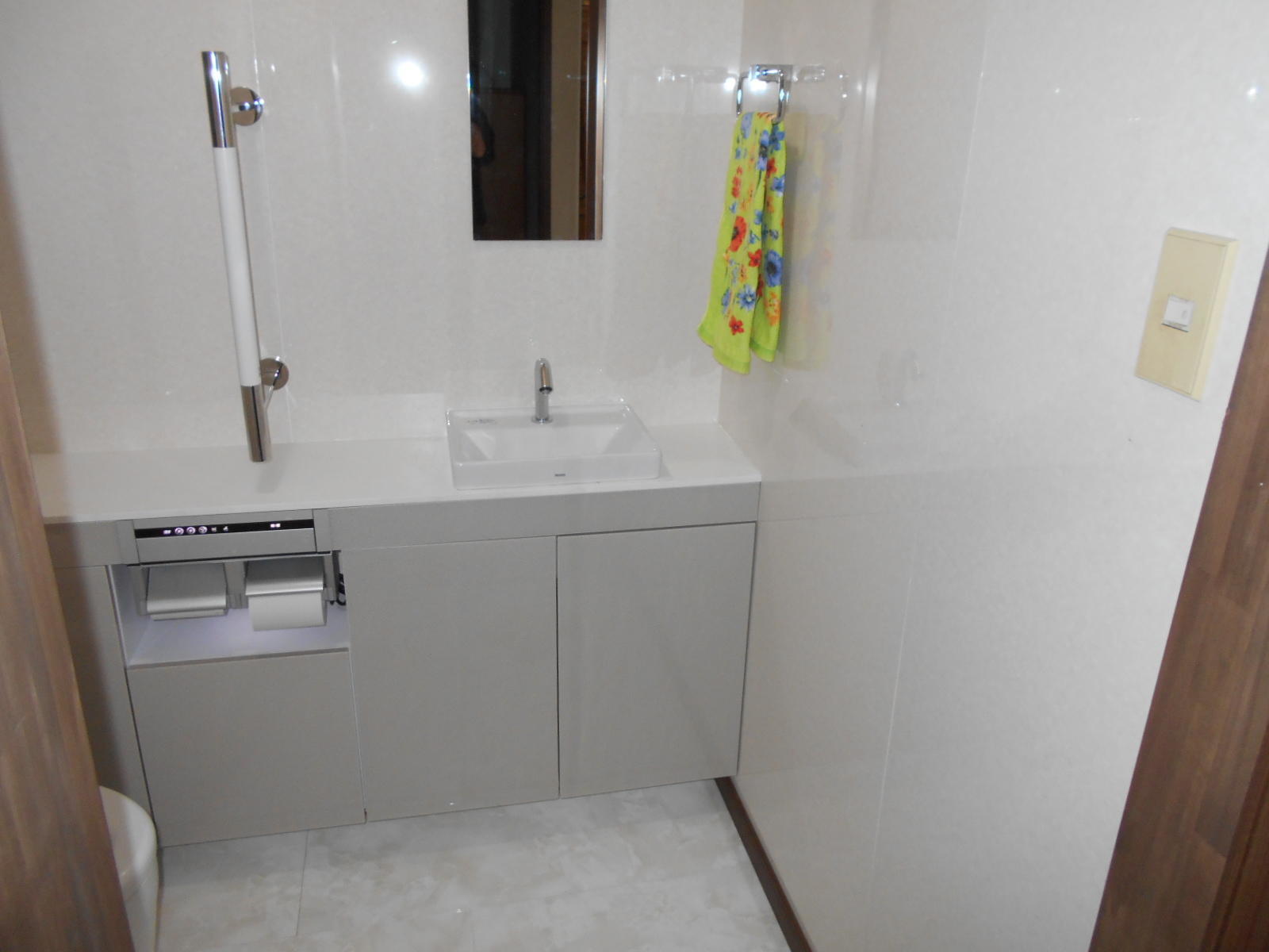 自慢のトイレに仕上げていただき大満足です(*^_^*)ママ友にトイレ使った後に「カッコいいトイレにしたんじゃない(^^)!?」と言われるのが楽しみです!笑 あと、私以上に旦那と息子が気に入っているらしく、母として誇らしいです(笑)私のお気に入りポイントは、ロボットみたいに出てくるビルトインリモコンと紙巻器の間接照明です!家族みんな大満足です‼