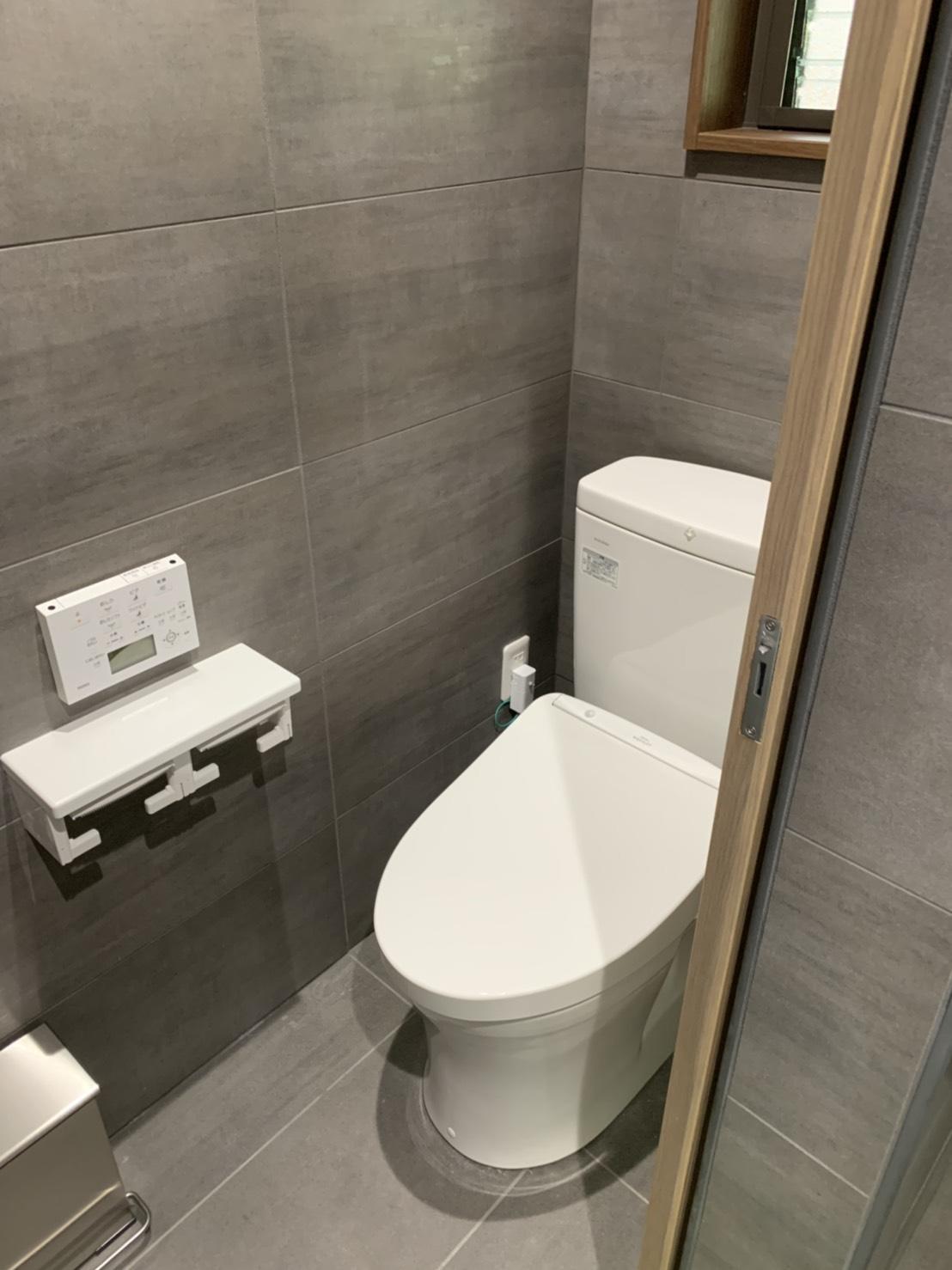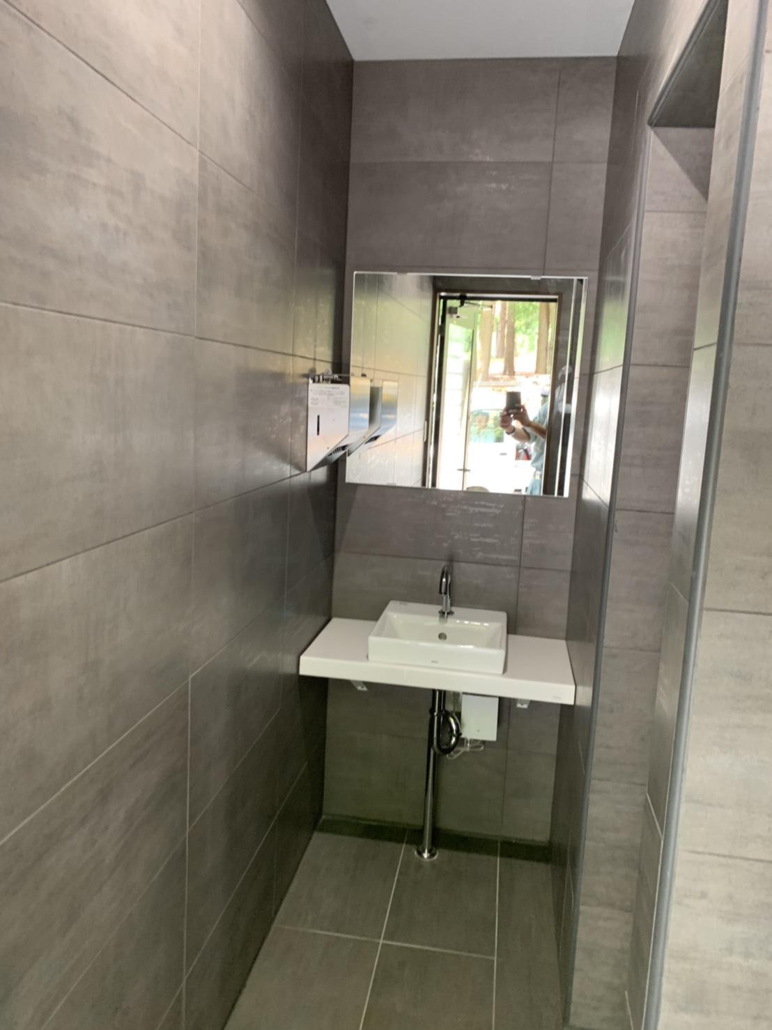 施設をご利用される皆様が使うトイレなので、汚れにくさやを重視しつつ、重厚感+高級感にこだわわり、カラーは、くすみ感の中にある柔らかさのアッシュグレーで統一し、壁・床は、重厚感漂う中に、くすみ感の中にある柔らかさで、重厚感漂うラグジュアリーを演出。落ち着く空間をご提案しました。