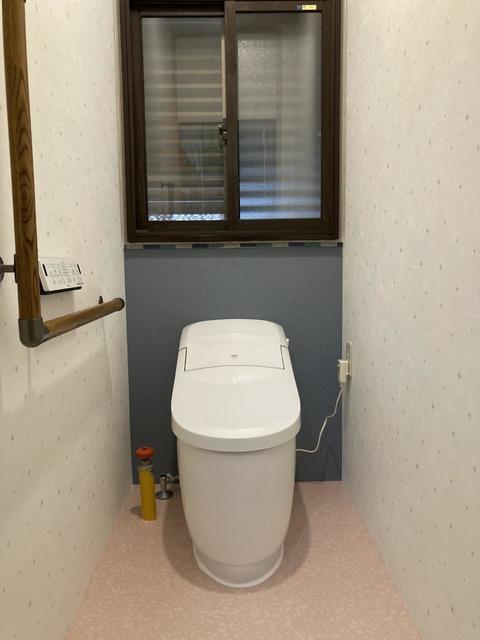 トイレはプレアスLSにすることによって見た目のスッキリさとスペースもゆったりとることができました。 床のクッションフロア、天井・壁クロスの貼替。中でも正面の壁クロスを変えることでアクセントになっています。 内装も一新して素敵な空間になりました。