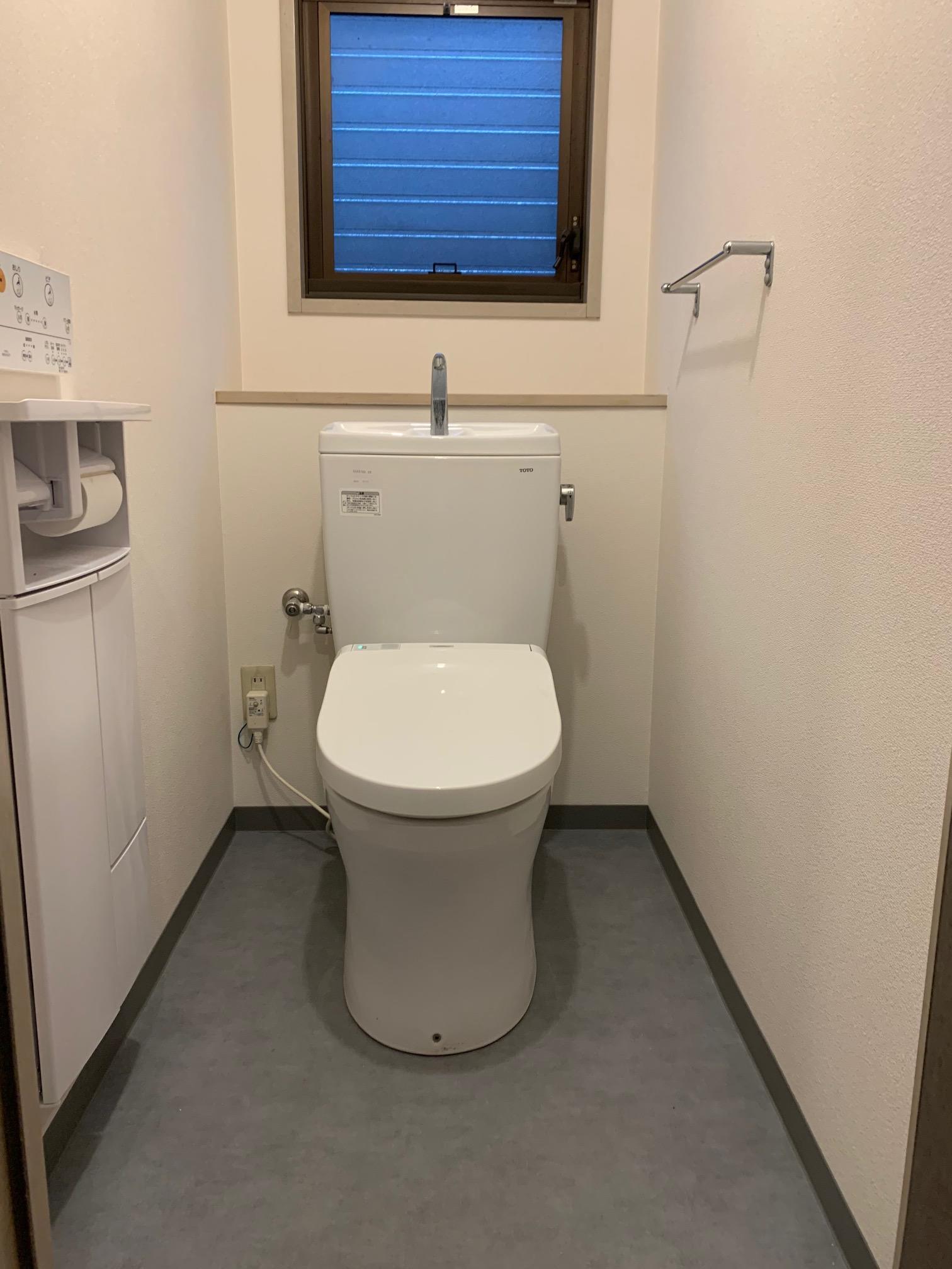 同じく隣のトイレルームのクロスを張り替えて収納キャビネットを交換してほしいとのご依頼でした。