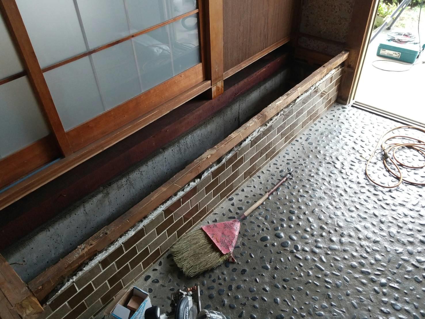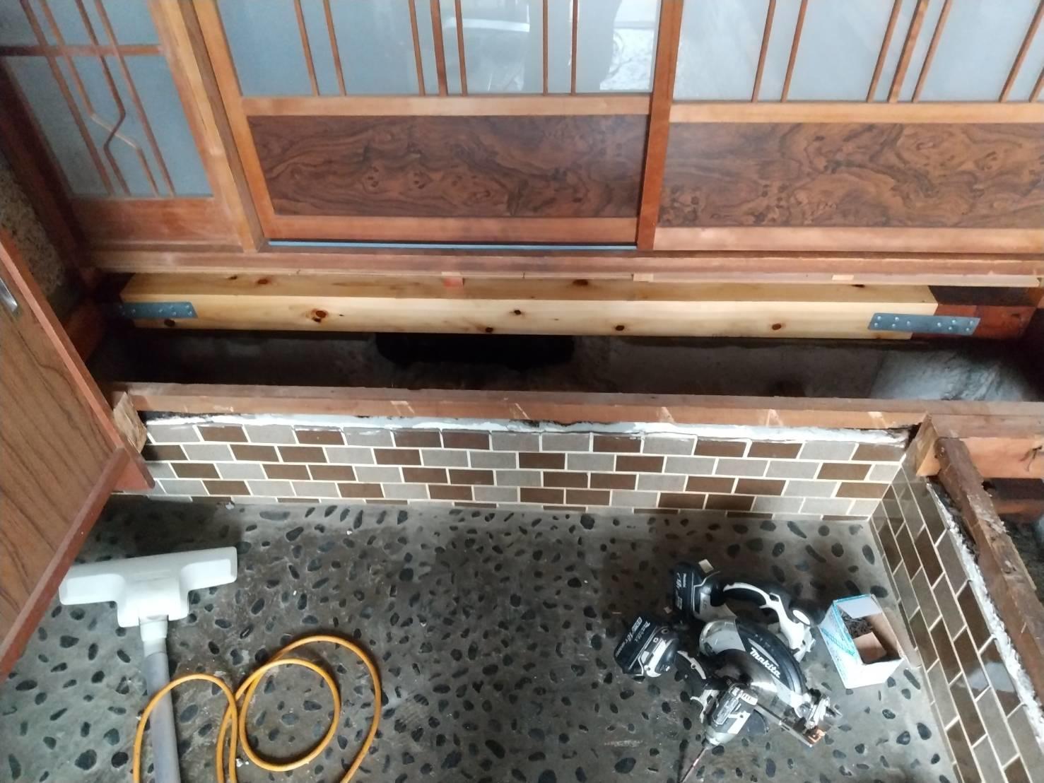 白蟻の被害を受けた玄関框と床材を解体し、新た玄関框を入れ、ホールの床は根太と構造用合板と断熱材の他、高耐久のフローリング材を張りました。 白蟻は湿気のある場所を好みます。在来タイルの浴室でも白蟻が棲み付く場合も多く見られますので、小さい穴が見受けられたときは、ご連絡くださいませ。