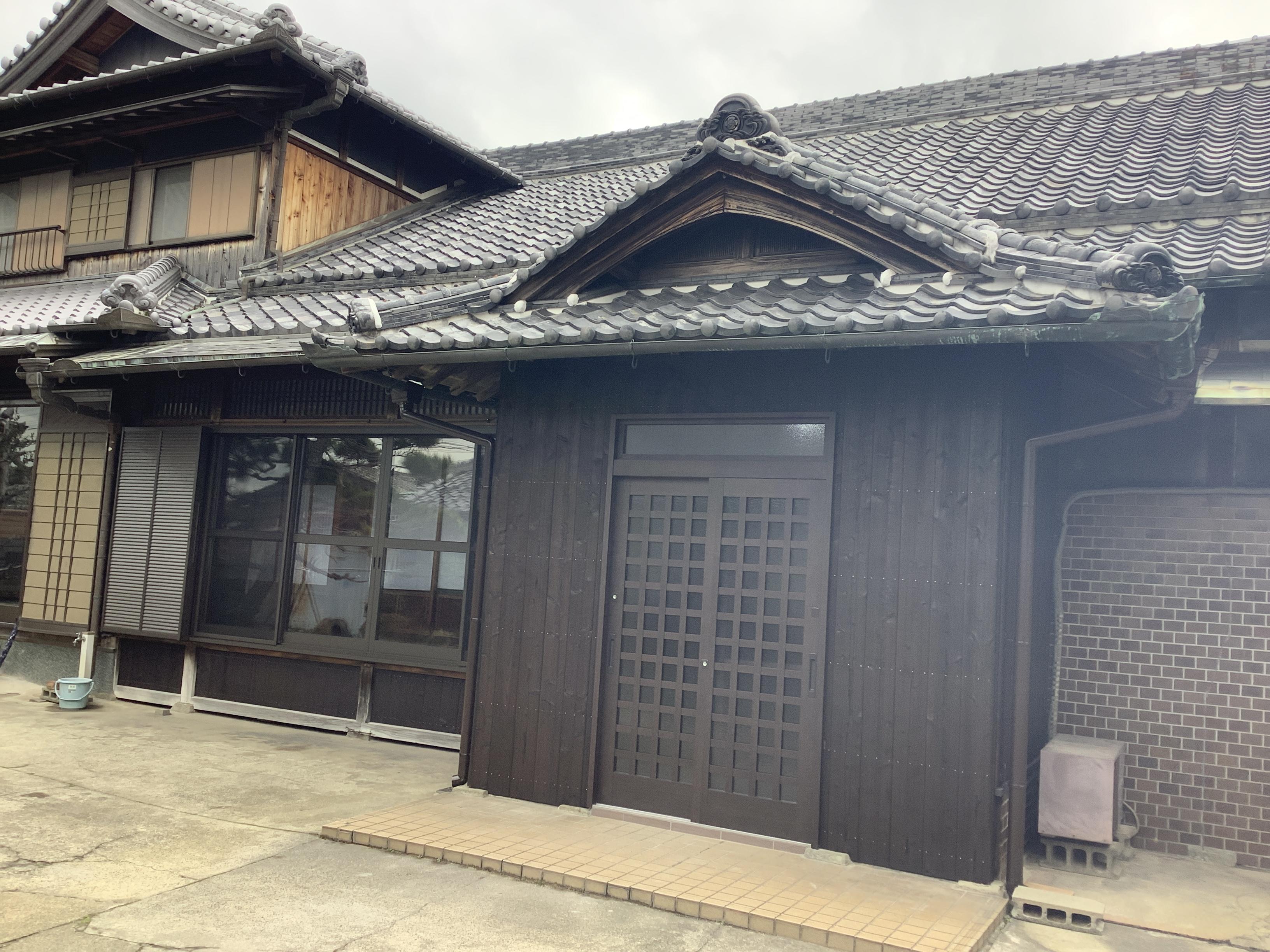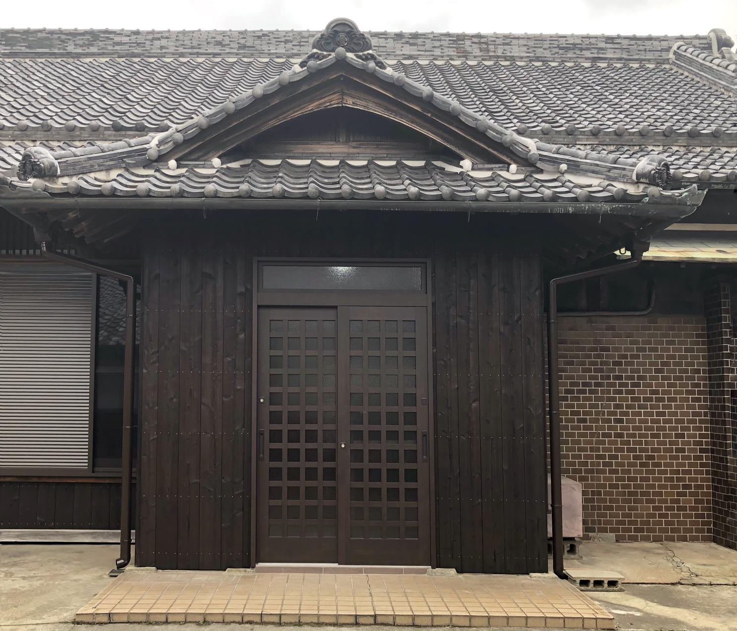 築100年以上の立派な家屋の木製玄関が老朽化によりきちんと玄関が閉まらなくなってしまいリフォームさせていただきました。外壁の漆喰も落ちてくるのでオシャレな焼杉板を選びました。