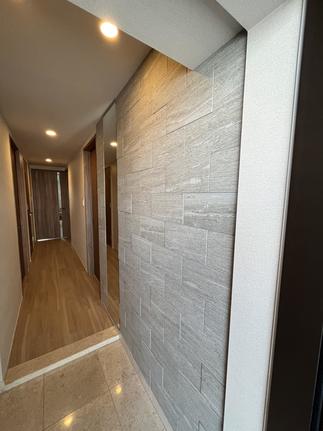 この度は工事のご依頼ありがとうございます。天井まであるオーダーミラーは、お出かけ前に全身を映し身だしなみチェックで足元まで映るので便利ですね。 また、お客様が選んだ『エコカラットプラス』のヴァルスロックを玄関の壁一面に貼り、玄関床の石張りと調和がとれお洒落で高級感のある空間となりました。 今後ともお困り事ありましたら、お気軽にご相談くださいませ。