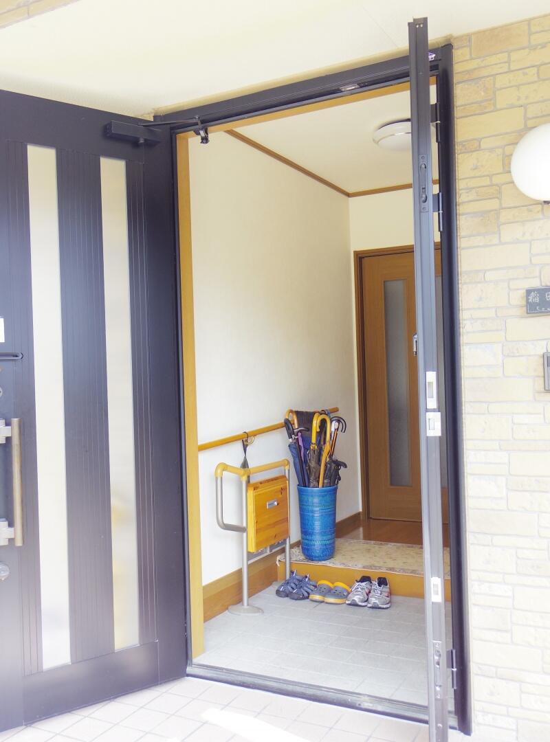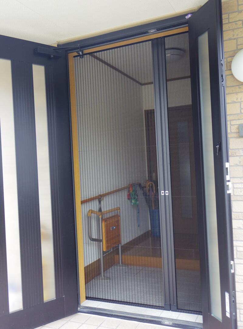 栃木県真岡市で、玄関網戸「しまえるんですα」の取付工事をさせていただきました施工事例です。