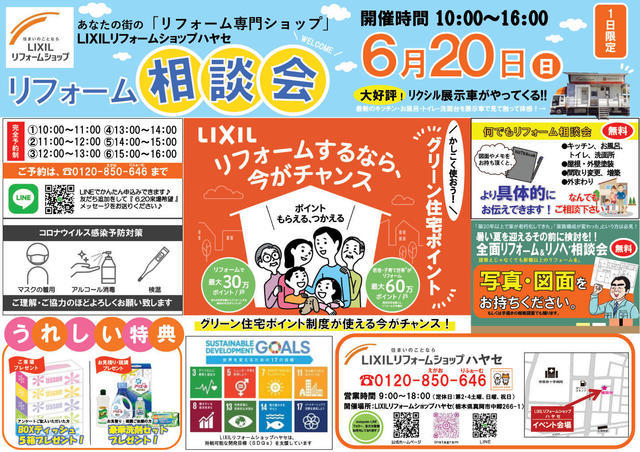 6/20(日)10:00~16:00に、1日限りのハヤセのリフォーム相談会を開催いたしますのでぜひご来場くださいませ(*^_^*)!