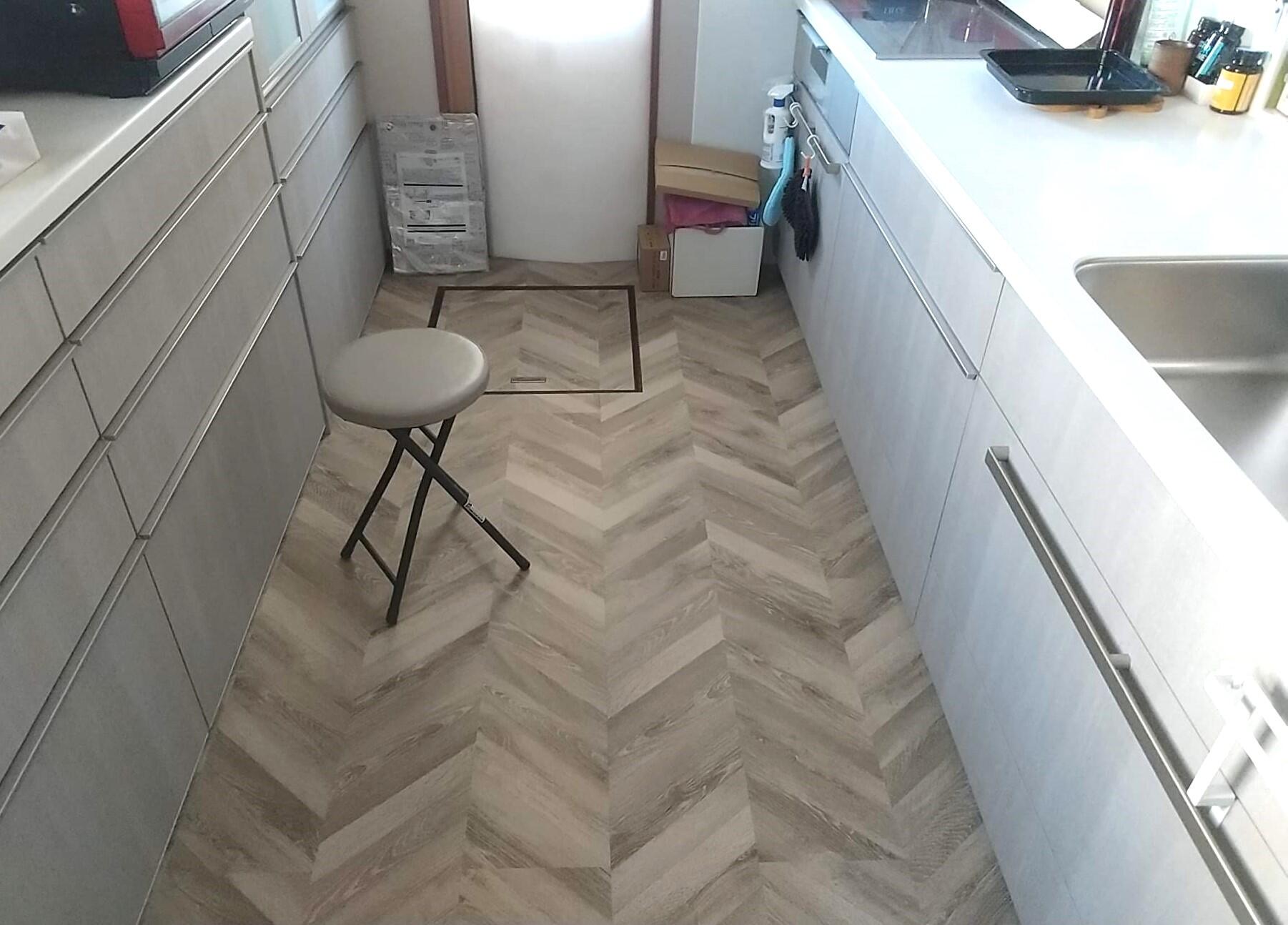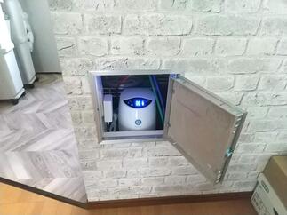 一番悩んだのは、お客様支給品の大きい浄水器の設置場所でした。 キッチン背面のデットスペースと腰壁の奥行をうまく使い納めました。カートリッジ交換がやりやすいと好評です。 クロス選びは奥様、娘さんのセンスが光りました。 カフェっぽくオシャレな雰囲気になりました。 満足して頂き非常に嬉しいです、ありがとうございました。