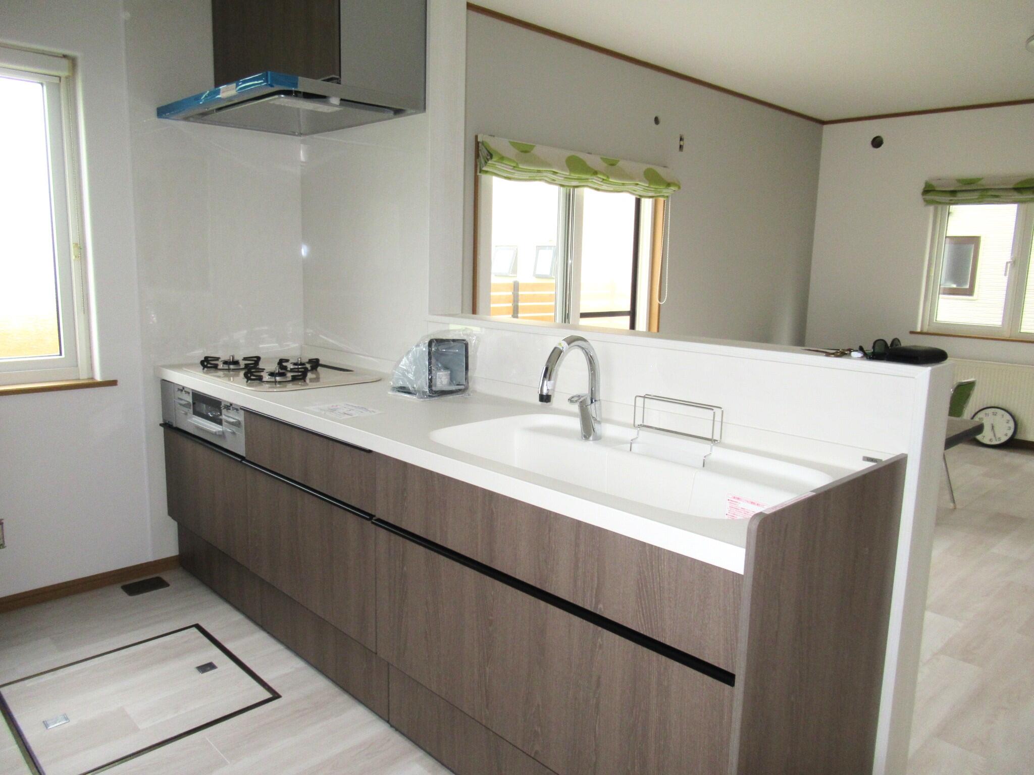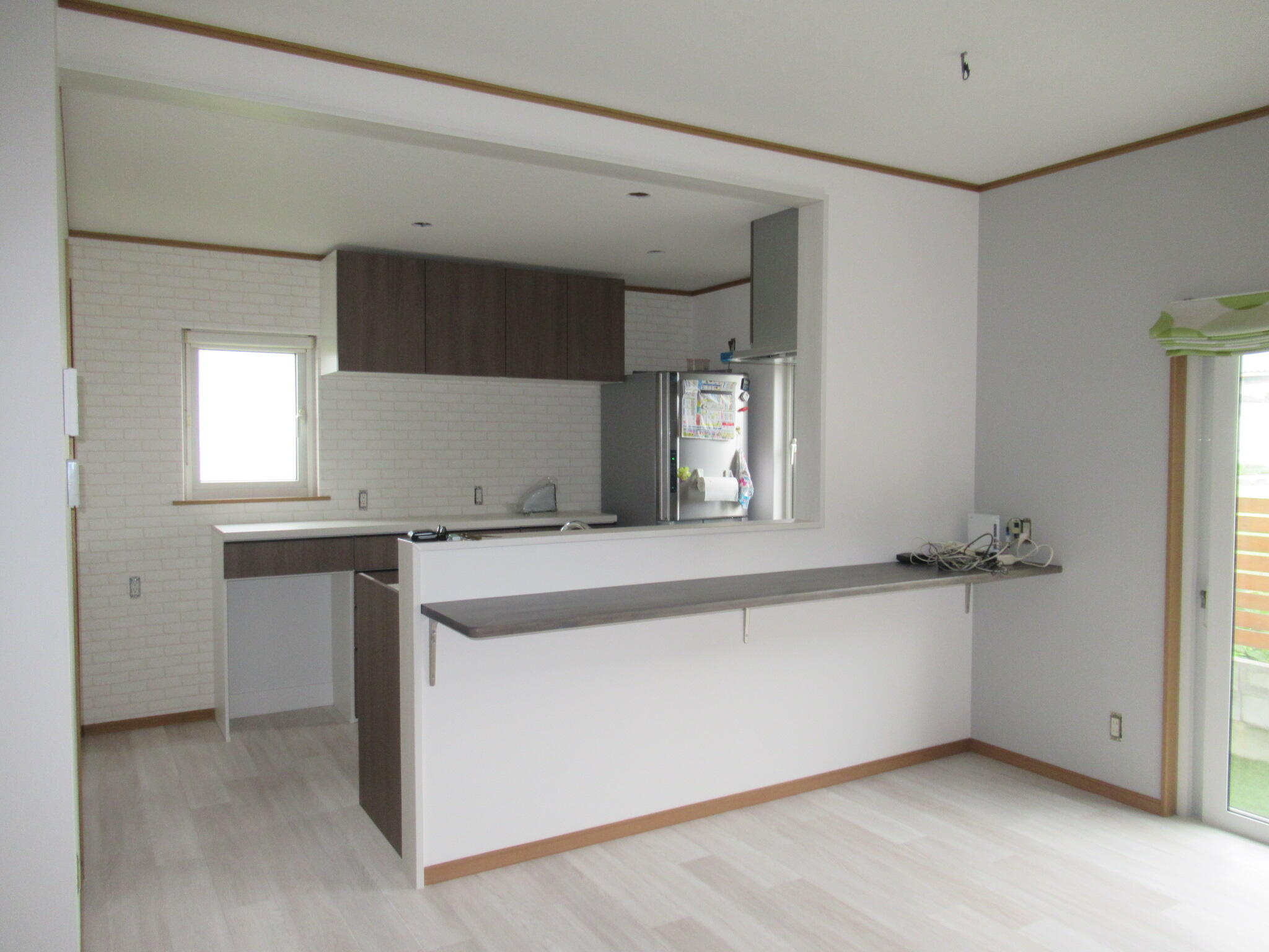 これまでのキッチンサイズよりも少し大きいサイズのシステムキッチンをご提案いたしました。 また、キッチン家電収納を採用することにより、これかでよりも収納しやすく、キッチンとの統一感を計りました。 また、フロアーはウッドタイルを重ね張りすることで工期のを短縮し、これまでとは違った色合いをご採用尾することにより、一層明るいLDKへ変身しました。