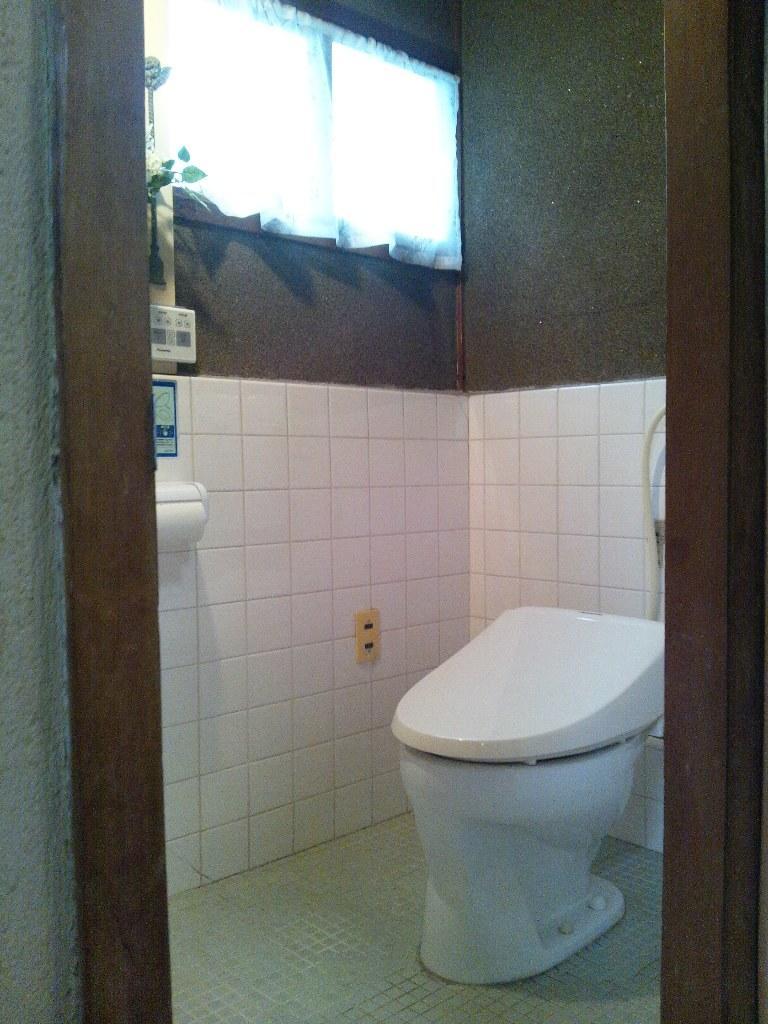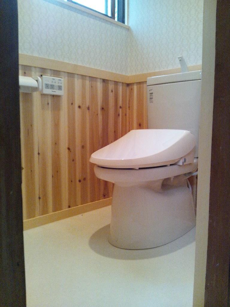 既存トイレは、床クッションフロアー壁タイル+腰上ジュラックスです。 腰板を貼るだけでこんなにイメージが変わります。
