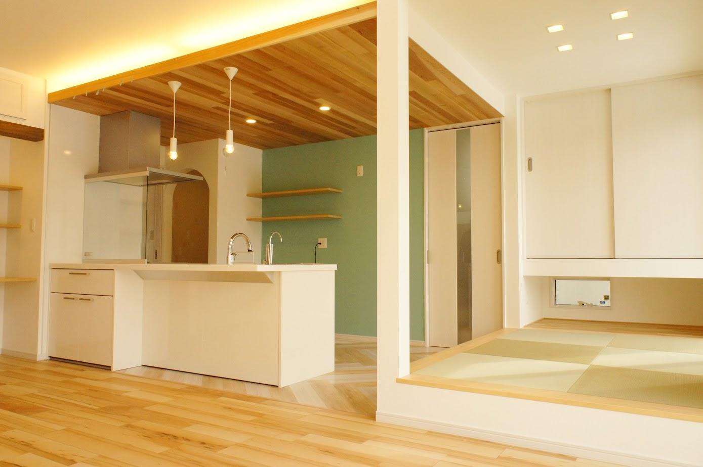 下がり天井のキッチンは、壁を設けずにワンフロアの空間をやんわりと仕切れて、