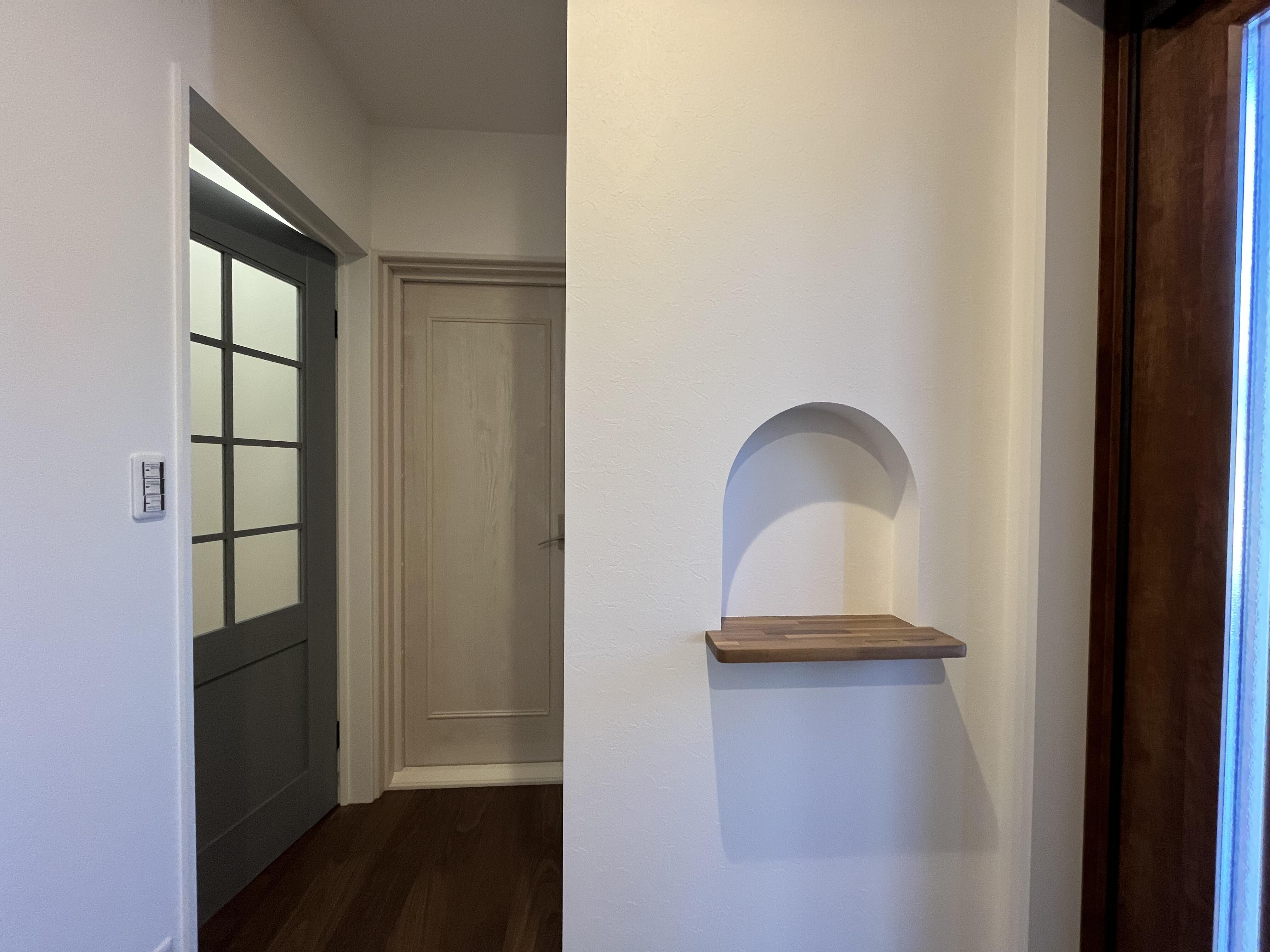 季節ごとの小物やお気に入りの雑貨を飾るのにぴったりのスペースです。帰宅したときにパッと目に入る小さなディスプレイコーナーとして、家族や来客をやさしく迎えつつ、空間のアクセントにもなる、心地よい存在感をプラスしてくれます。