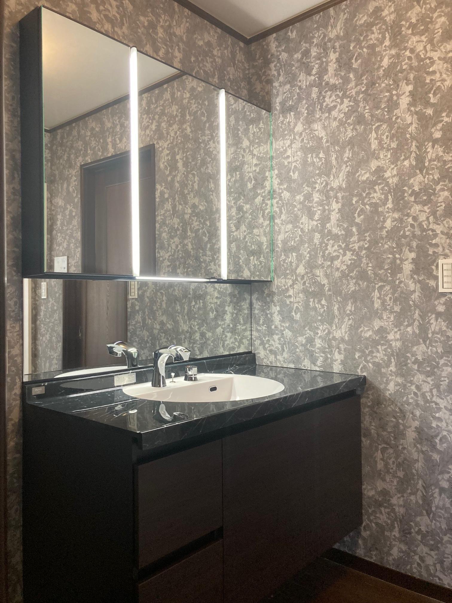 LIXILプレミアムドレッサー「ルミシス」 高級感溢れるラピシアカウンター ムーディーな空間の中でも左右からの光で顔に影をつくりにくフェイスフルライト 照明も水栓も手を触れないタッチレス仕様 プレミアムの名にふさわしいホテルライクなドレッサーです