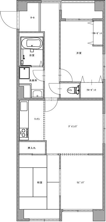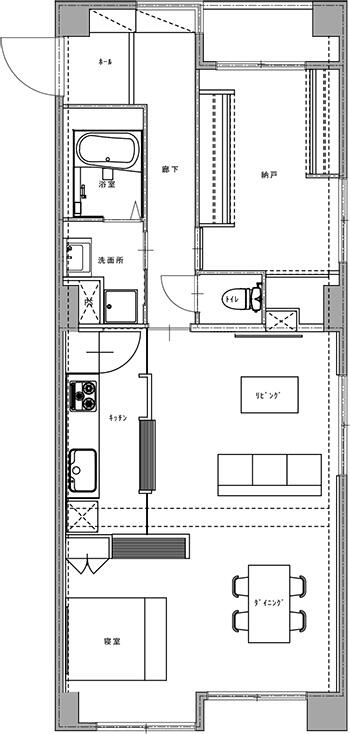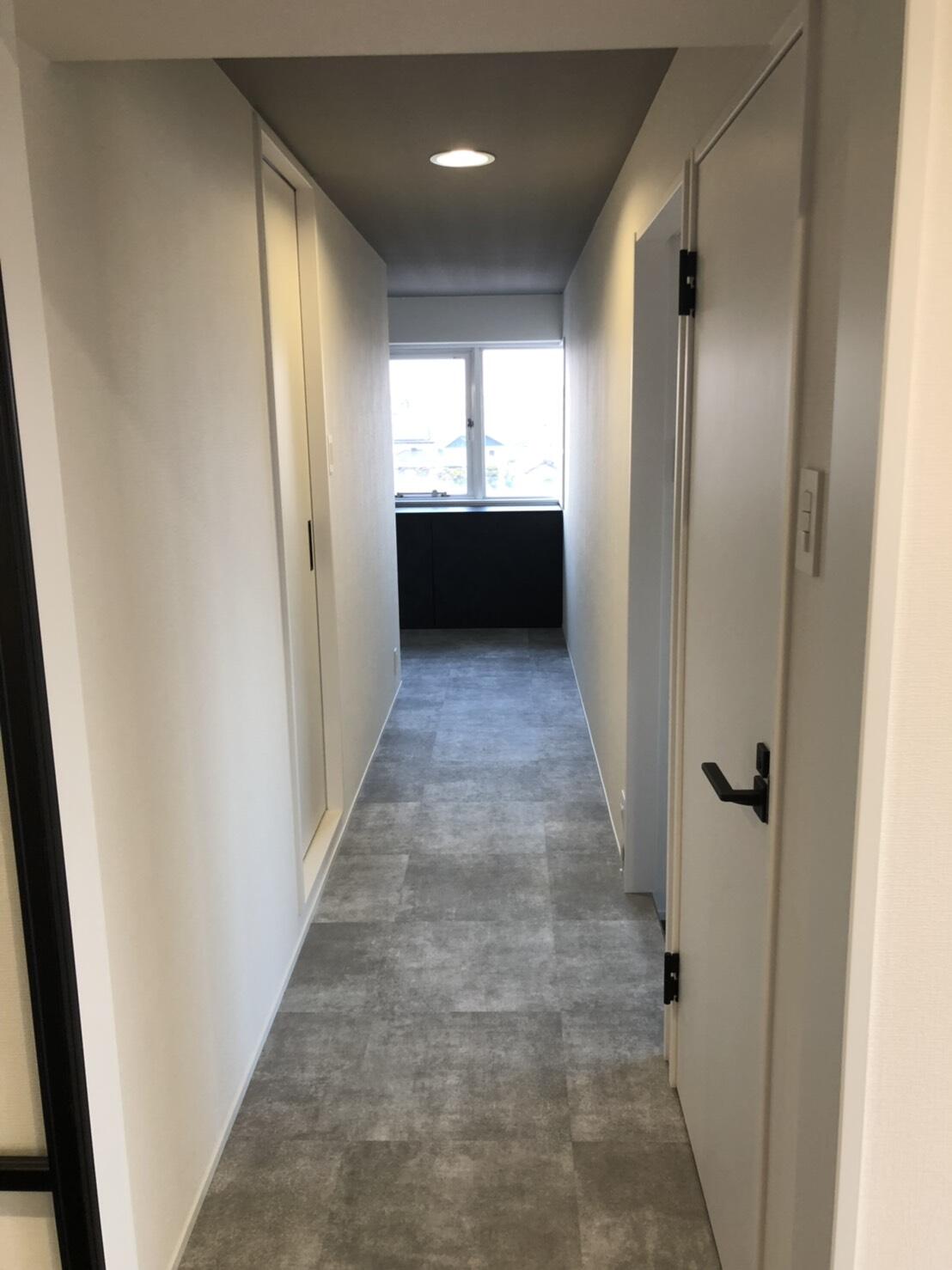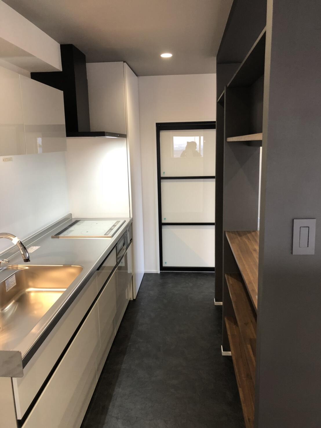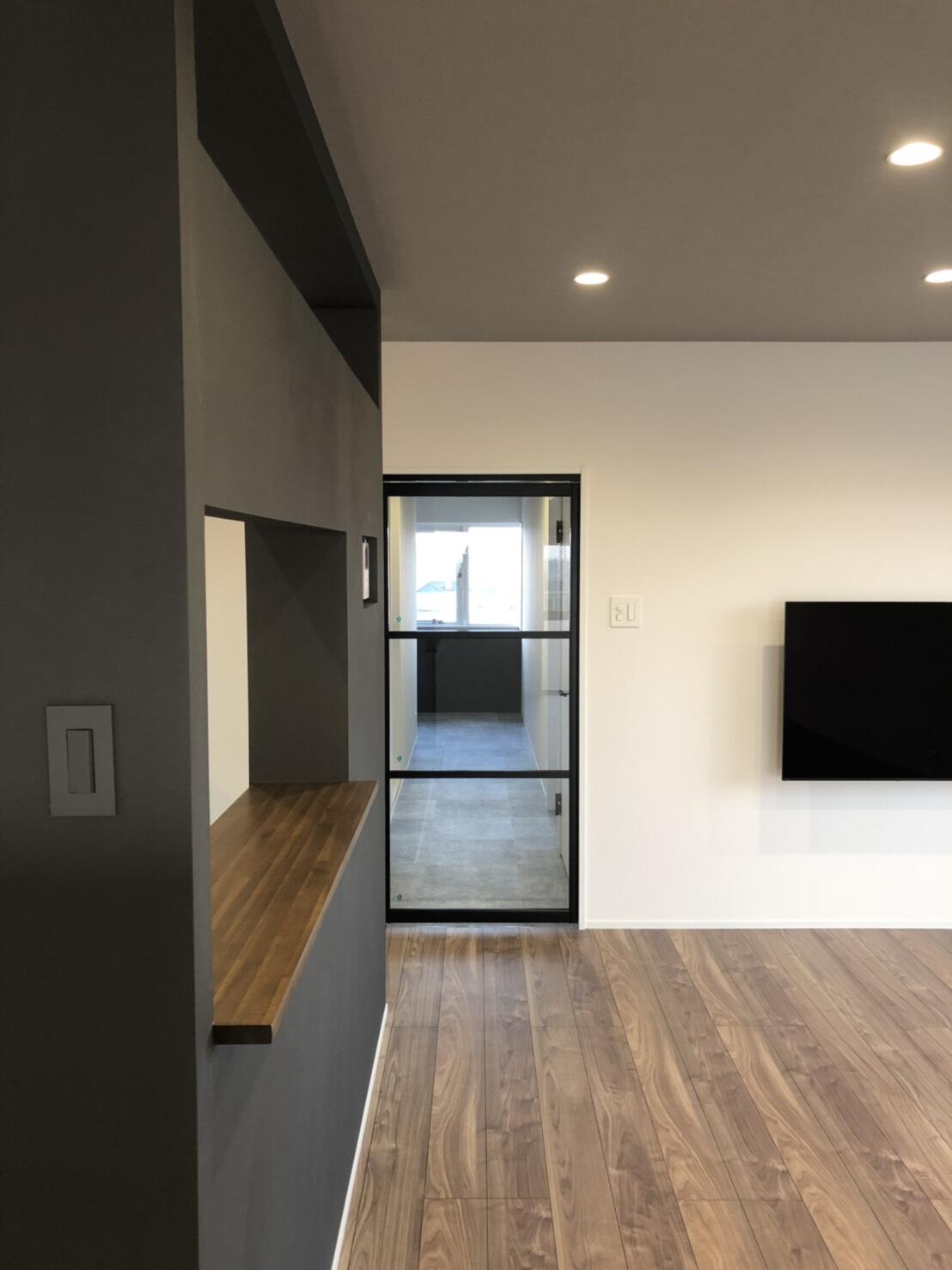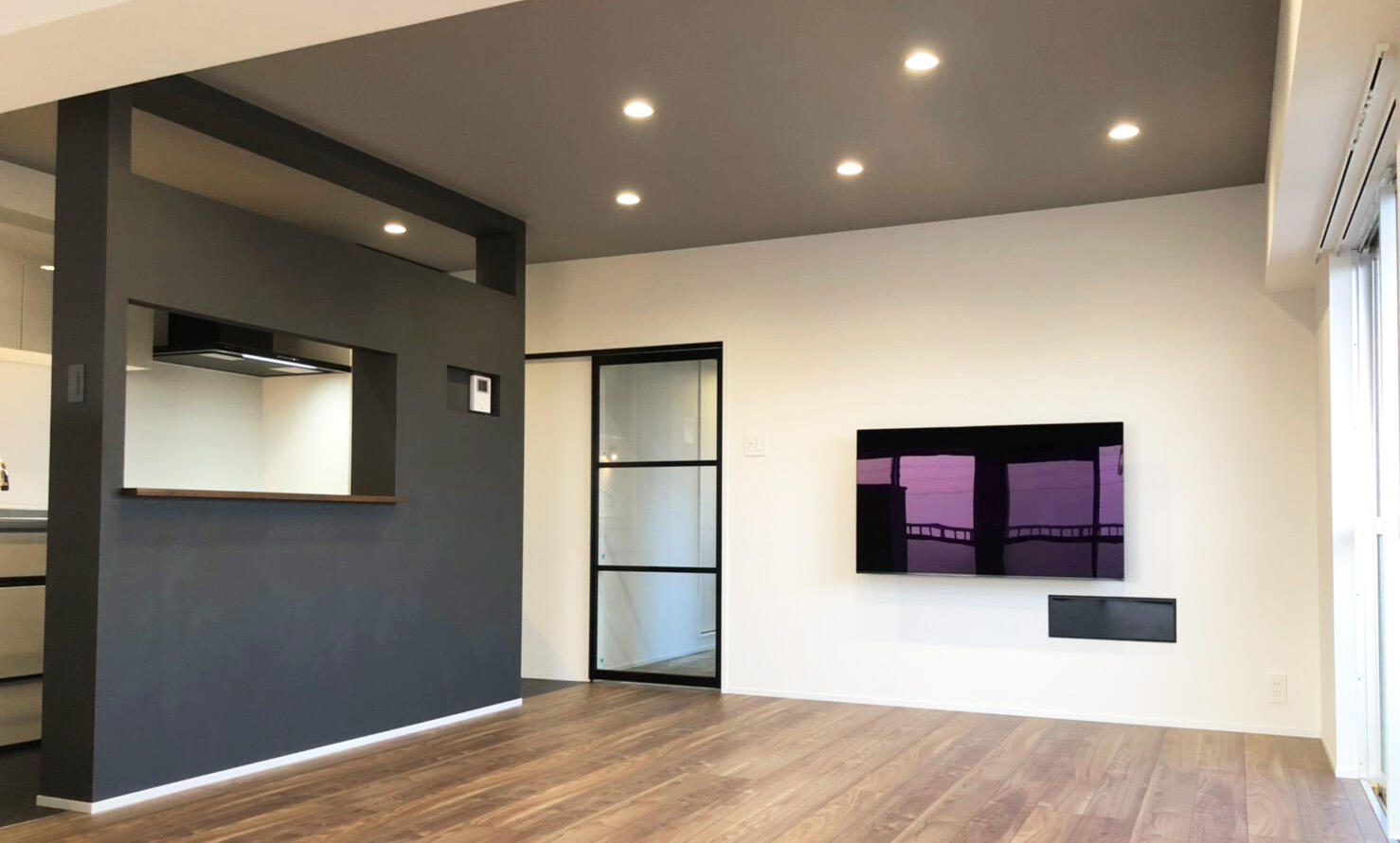 キッチンを隠すことのできる目隠し壁。部屋のアクセントでもあり、生活感を少なくする役目も持ち合わせています。 全体的に落ち着いた色合いでまとめ、リラックスできる空間になるようにコーディネートしました。