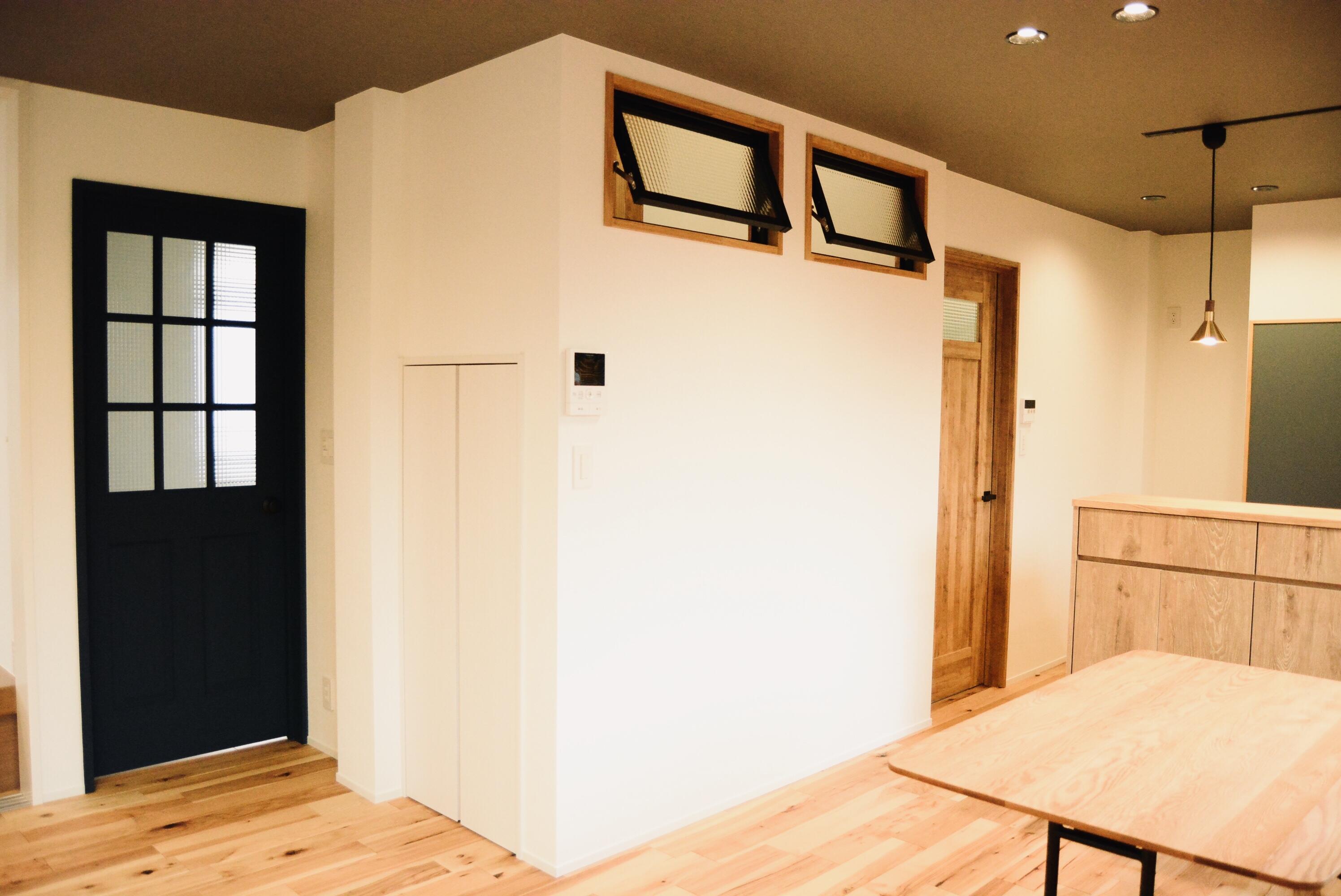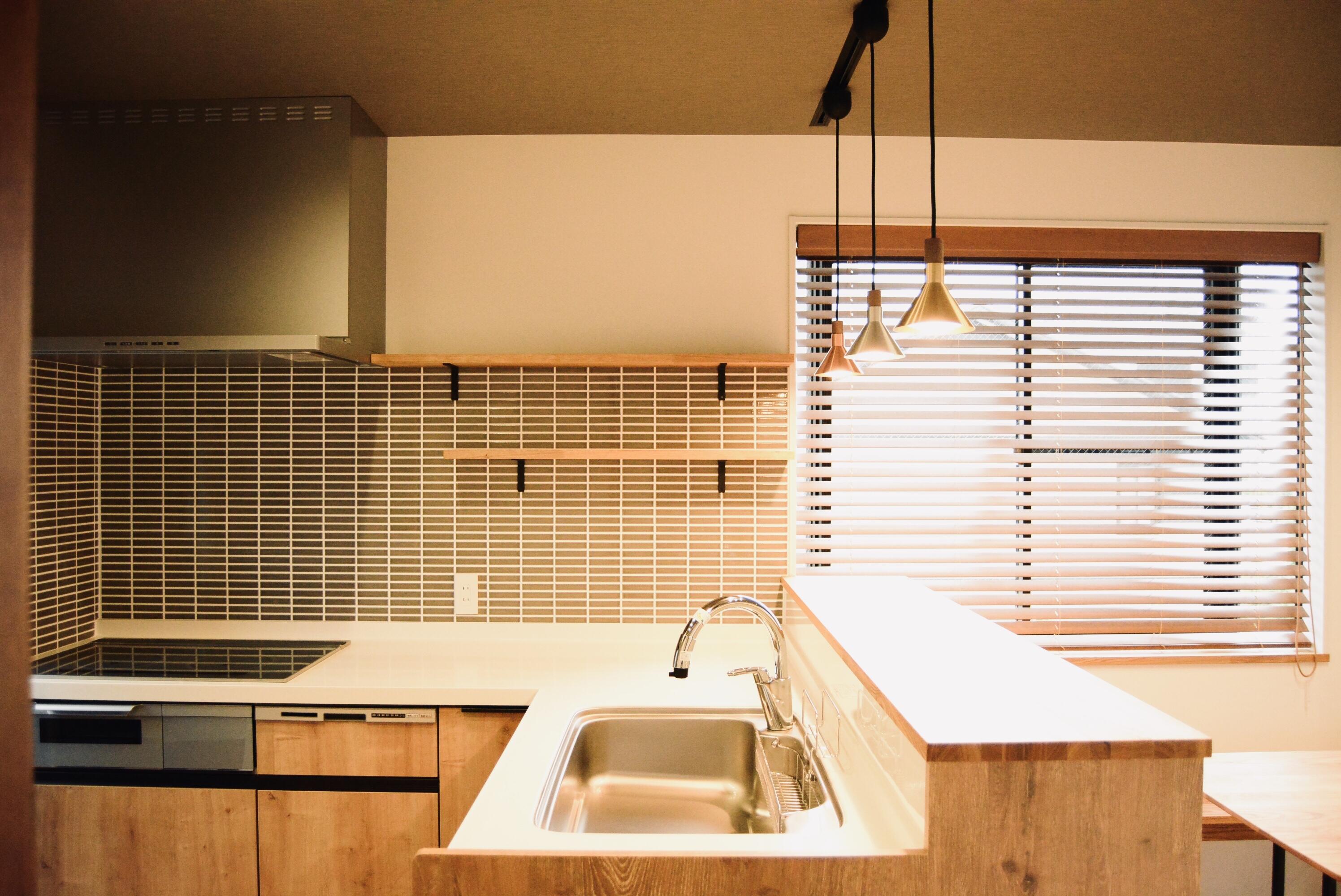 元々あった吊戸棚を撤去することでキッチンからリビングまで見渡すことができるように。キッチンの壁にはグレーのタイル貼ることで、天井のグレークロスにマッチし一体感が増しました。