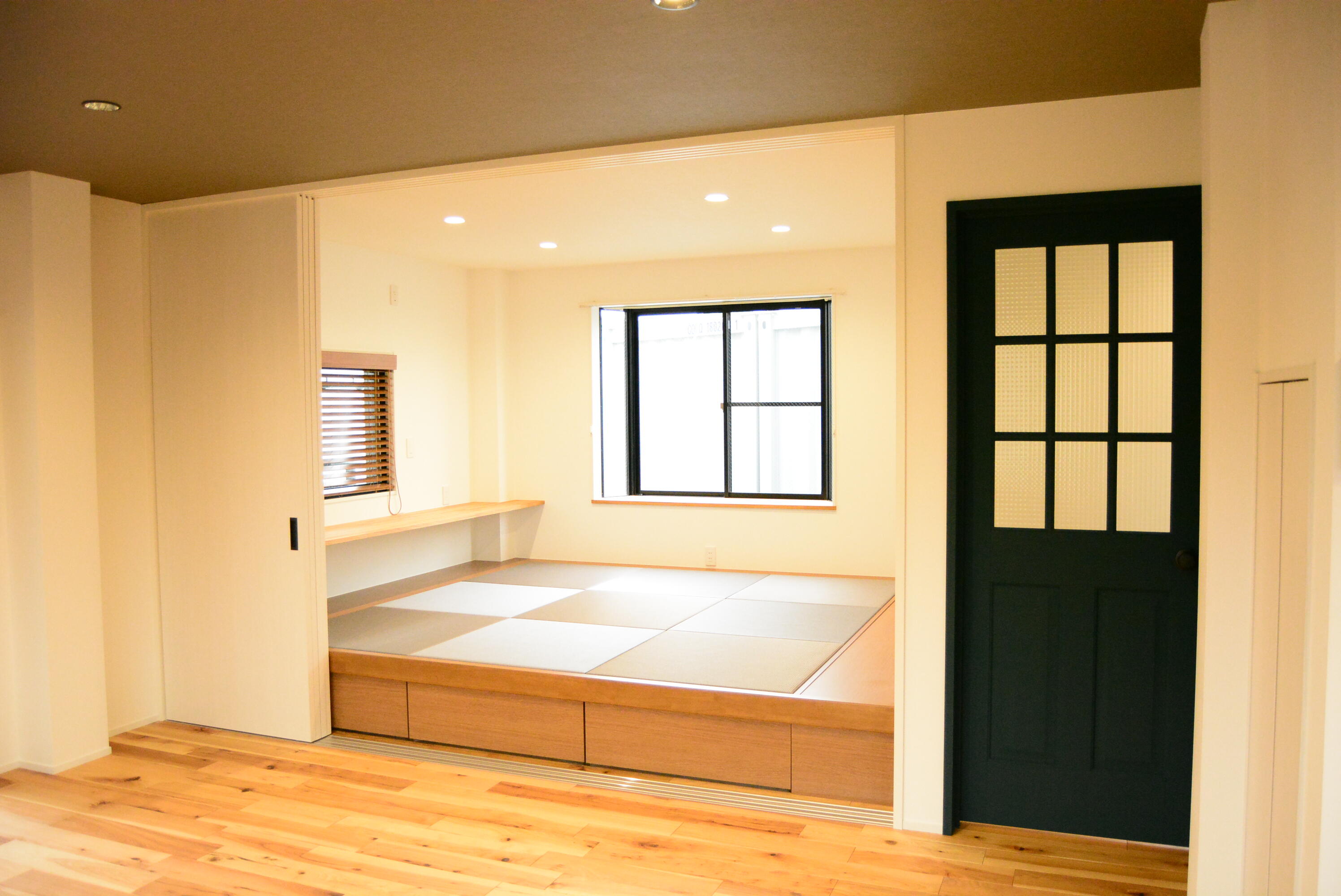 リビングの横には小上がりの畳スペースを設けました。引き出し式の収納をたっぷりと確保し、空間を有効活用。お子さまの遊び場や、ごろりと横になれるリラックススペースとしても活躍します。