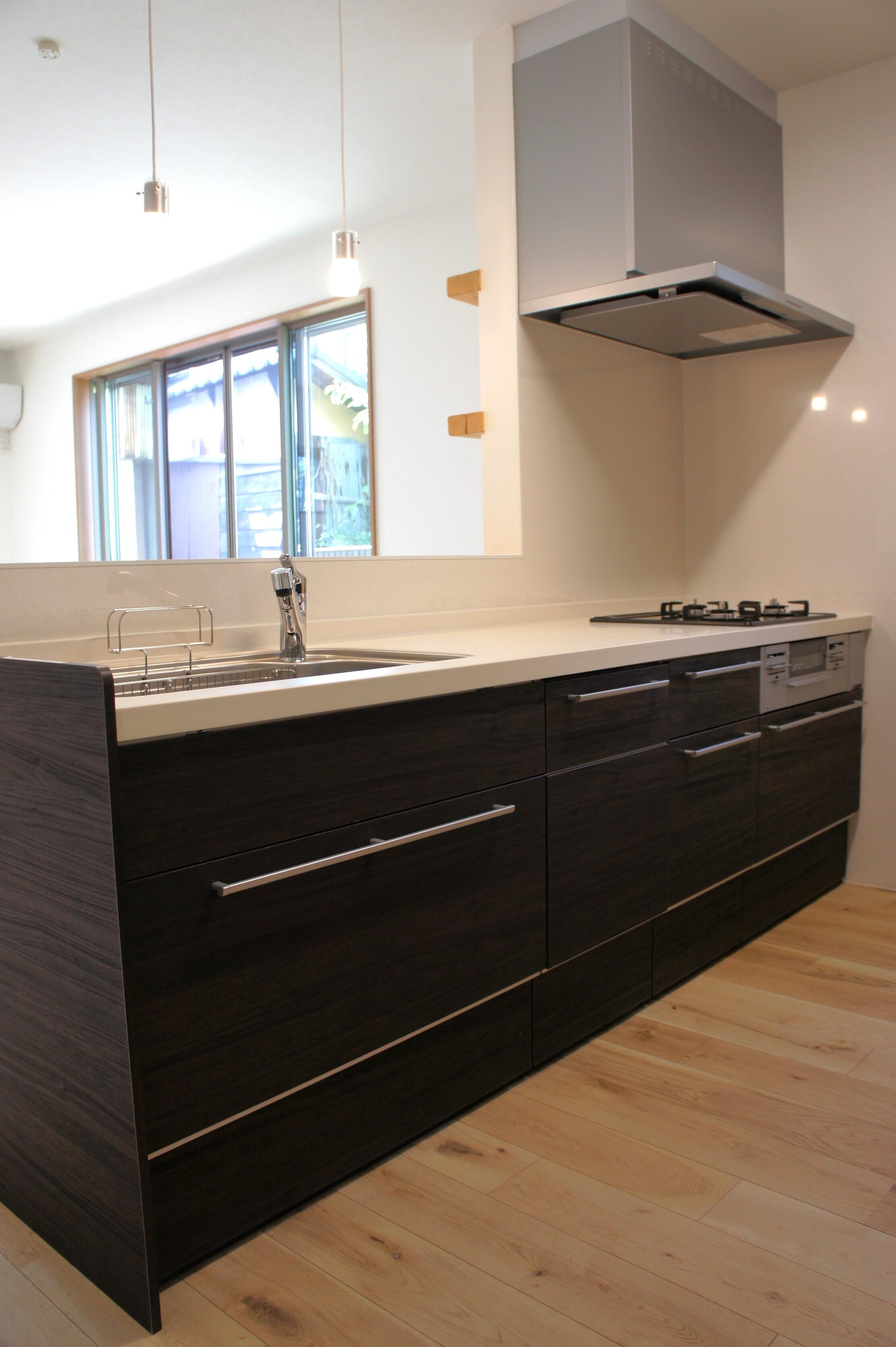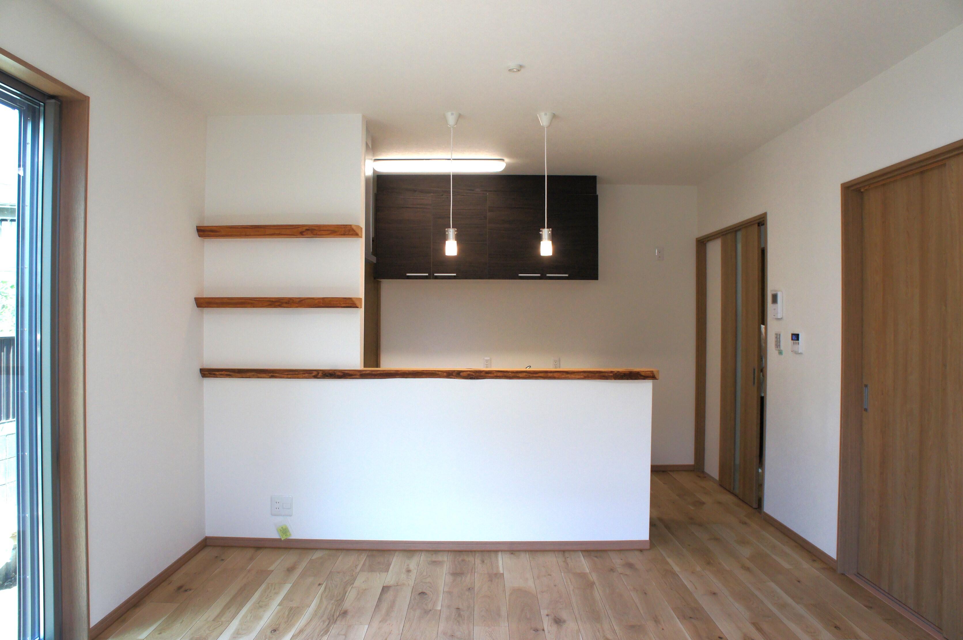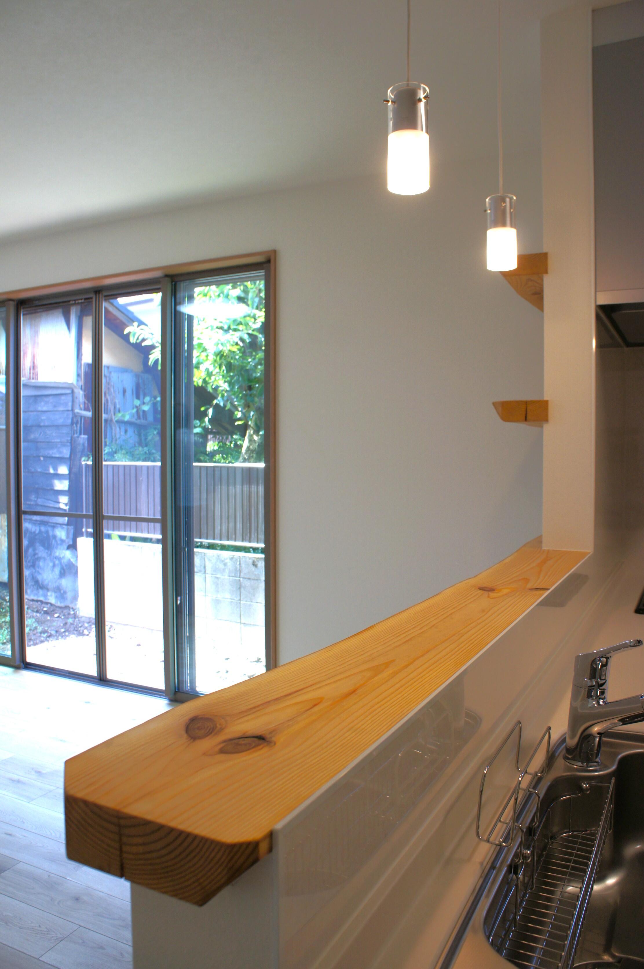 戸建の1・2Fを全面改装 腰壁を造作し対面キッチンを実現。 大きな既存梁を加工し、カウンターやベンチに生まれ変わりました。 一工夫することで叶えられることが増えわくわくしたリフォームに。