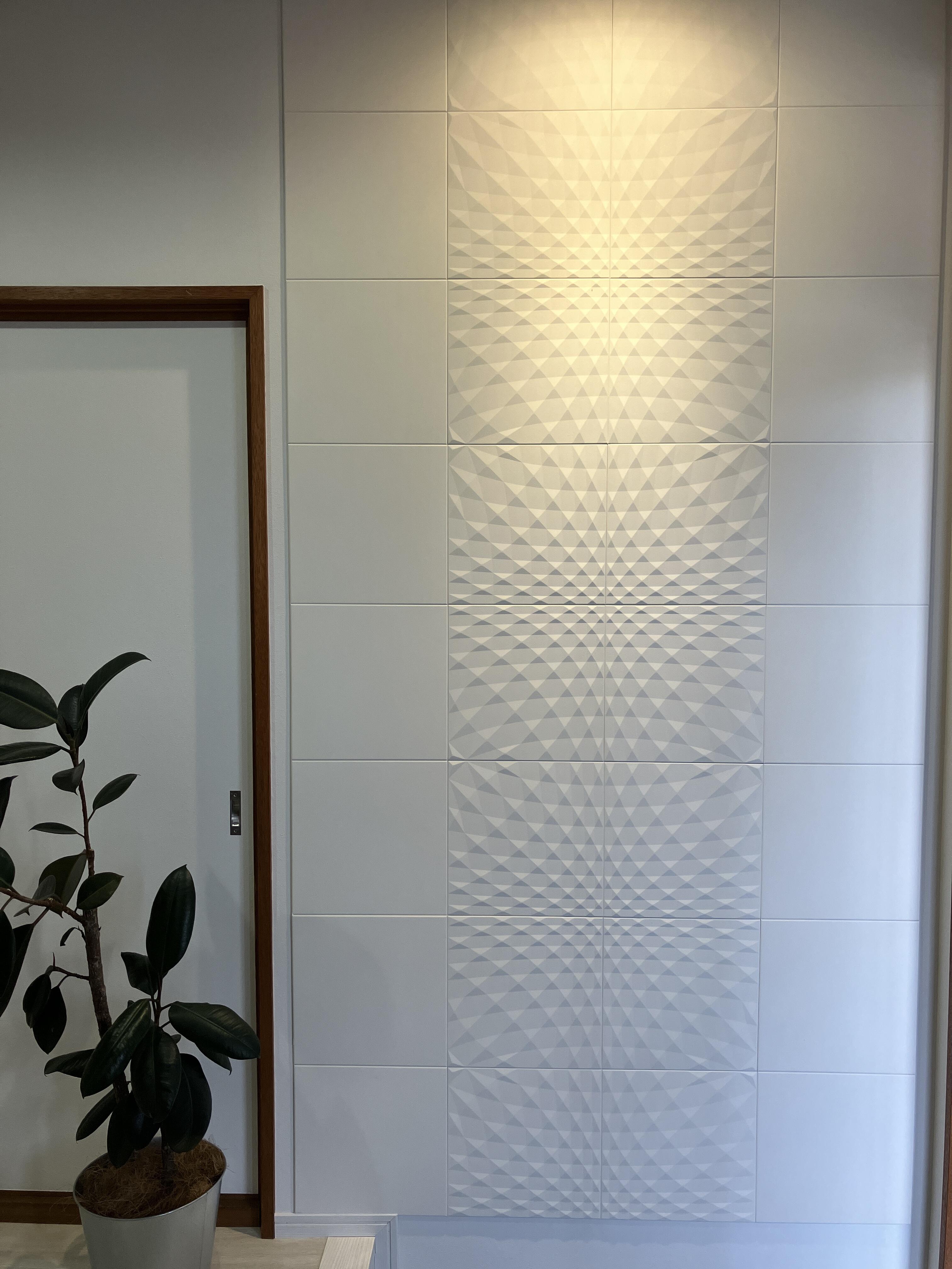明るい清潔感のある内装に仕上げ、テレビ背面には高級感のある【LIXILエコカラット:ディニタ】を採用。