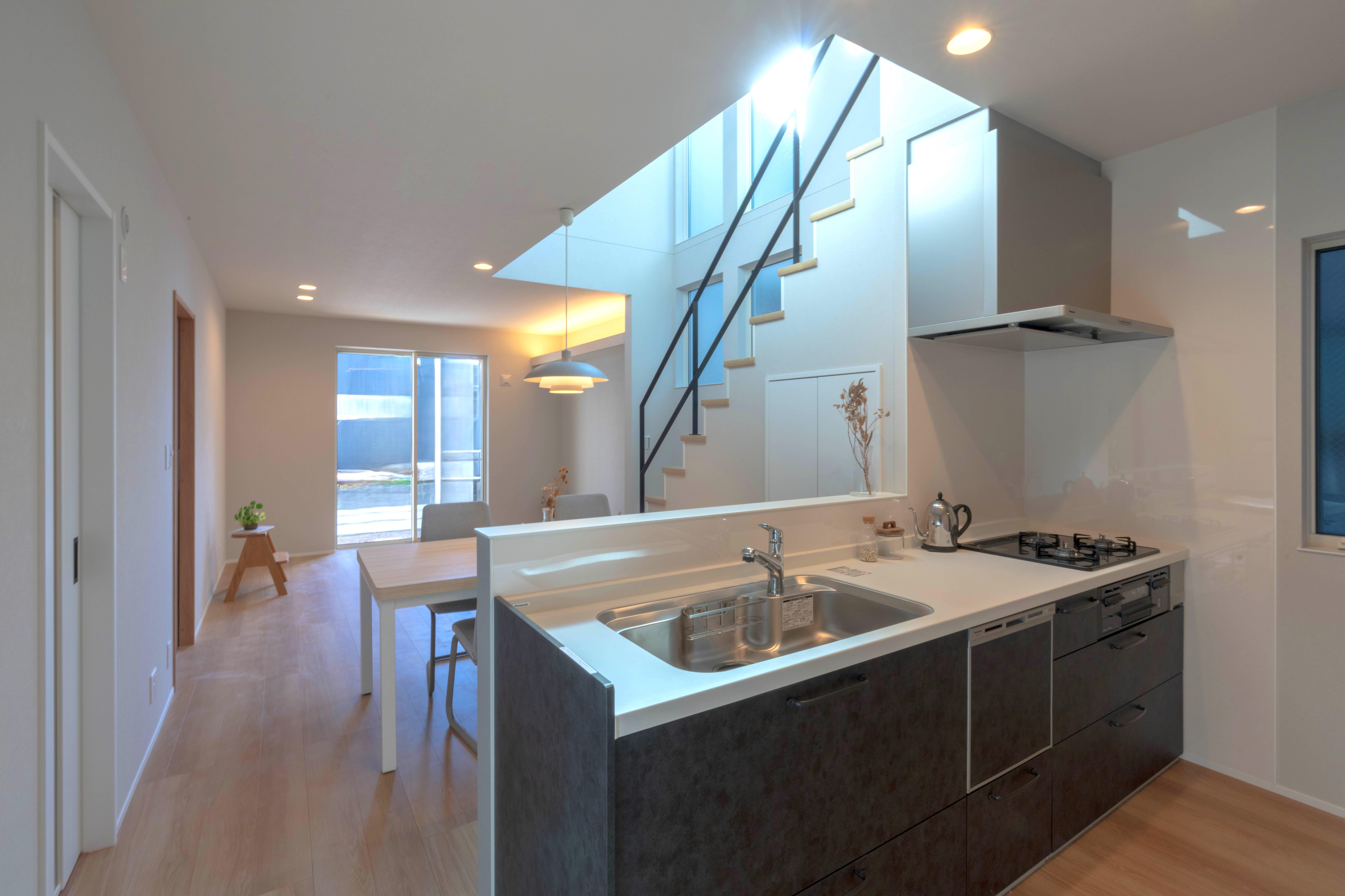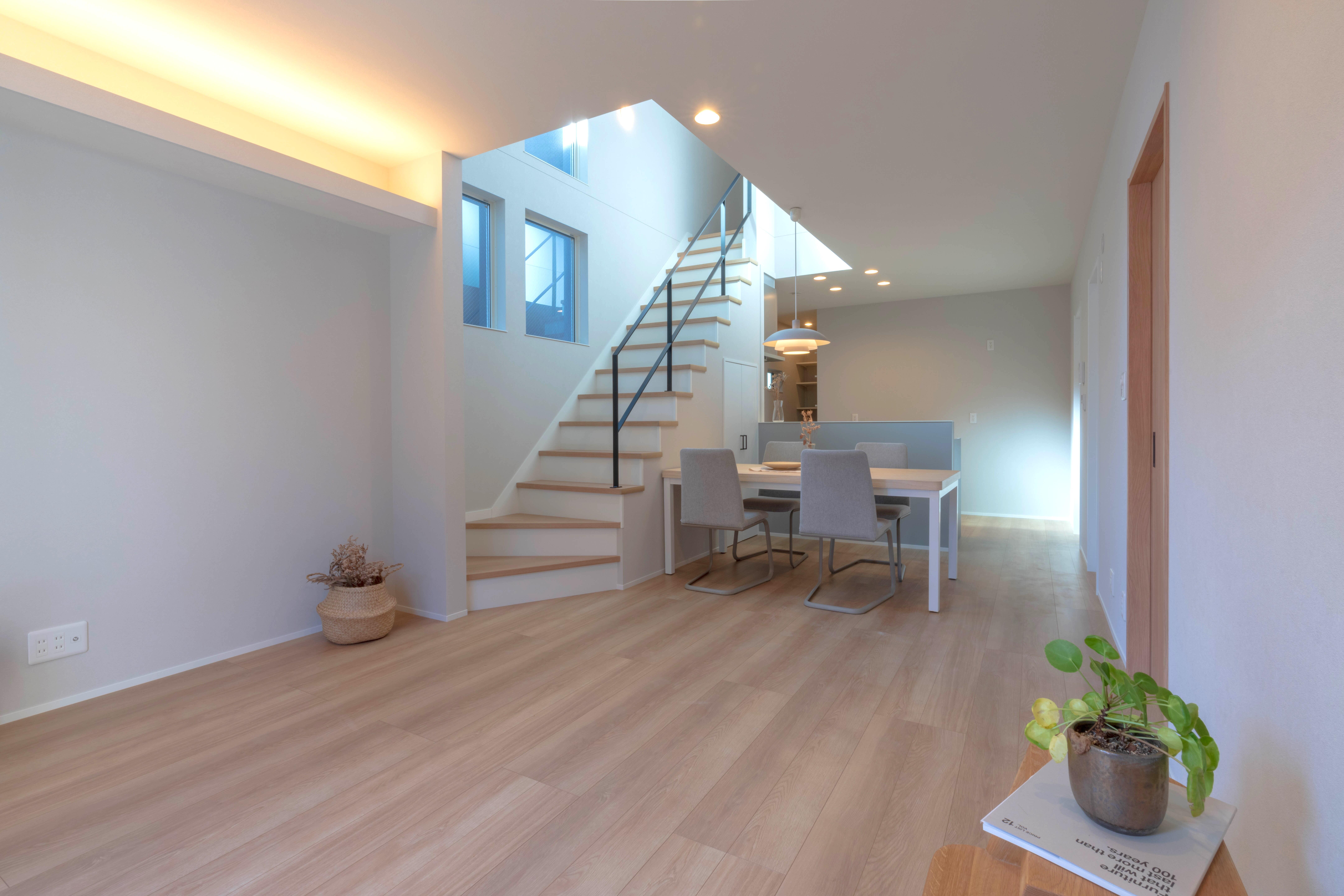 オーク材のやさしい色合いを基調に仕上げた、ナチュラルテイストの住宅。 吹抜のリビング階段からは、光が注ぎ、家のどこにいても穏やかな空間が流れます。