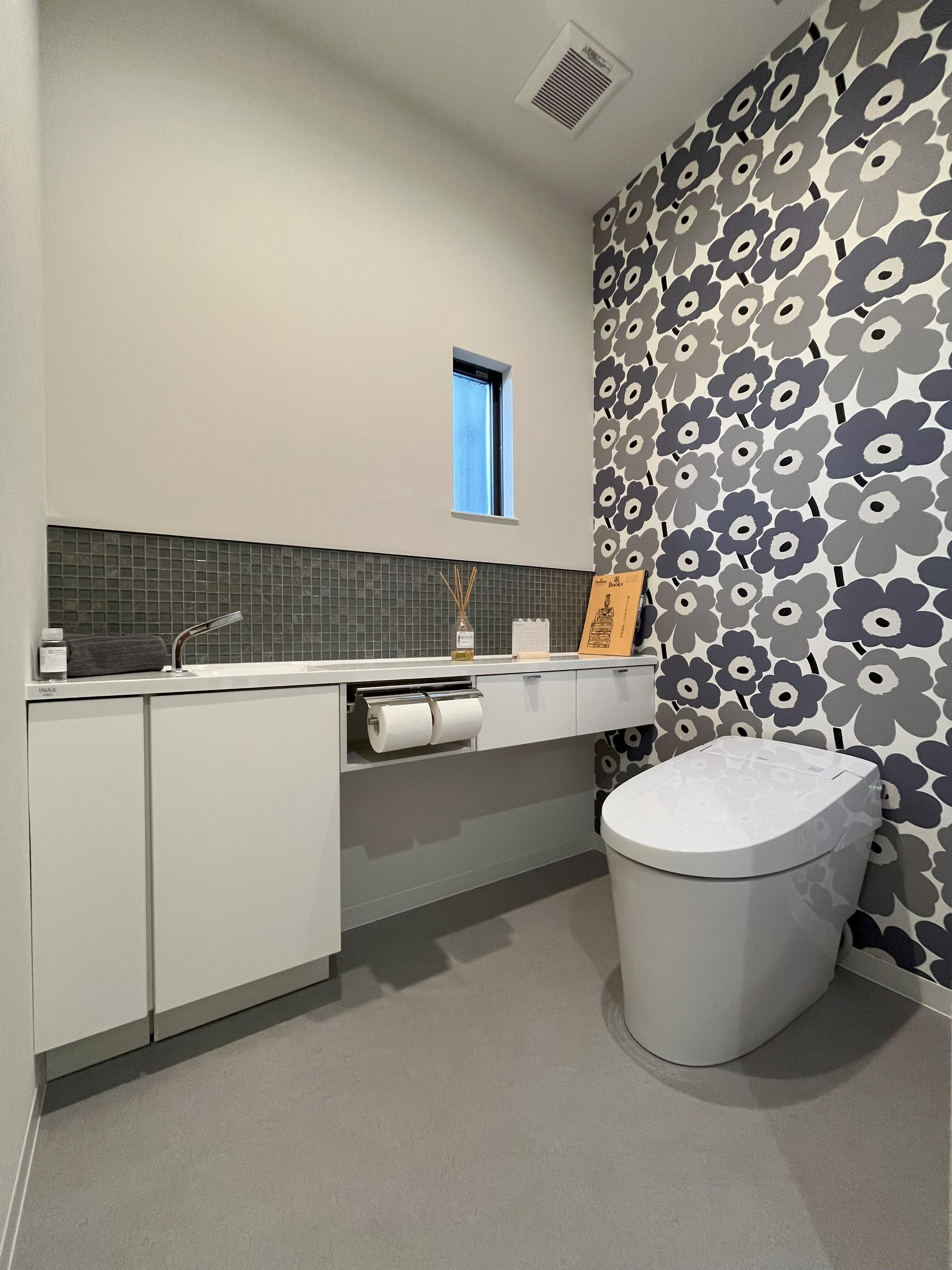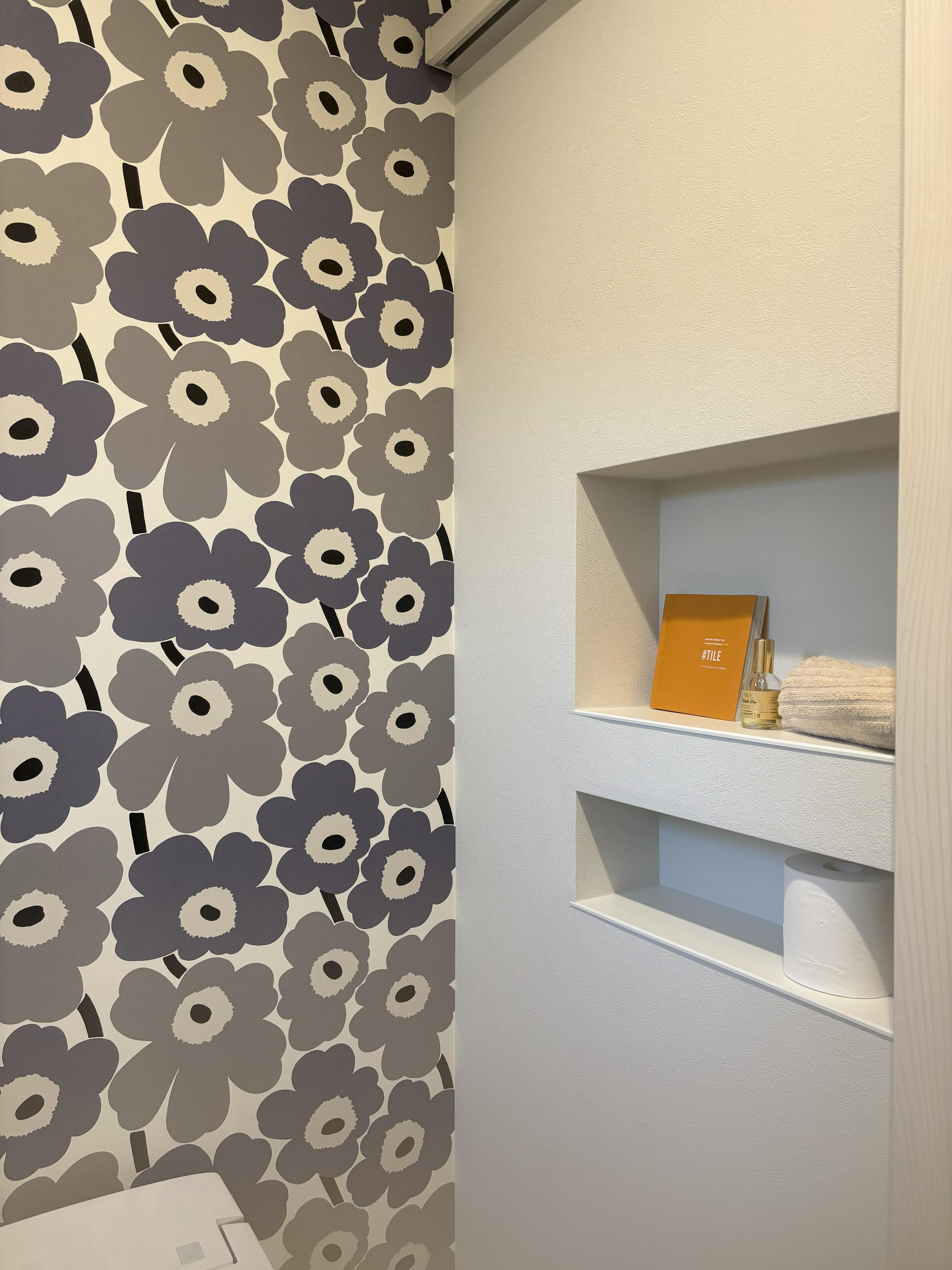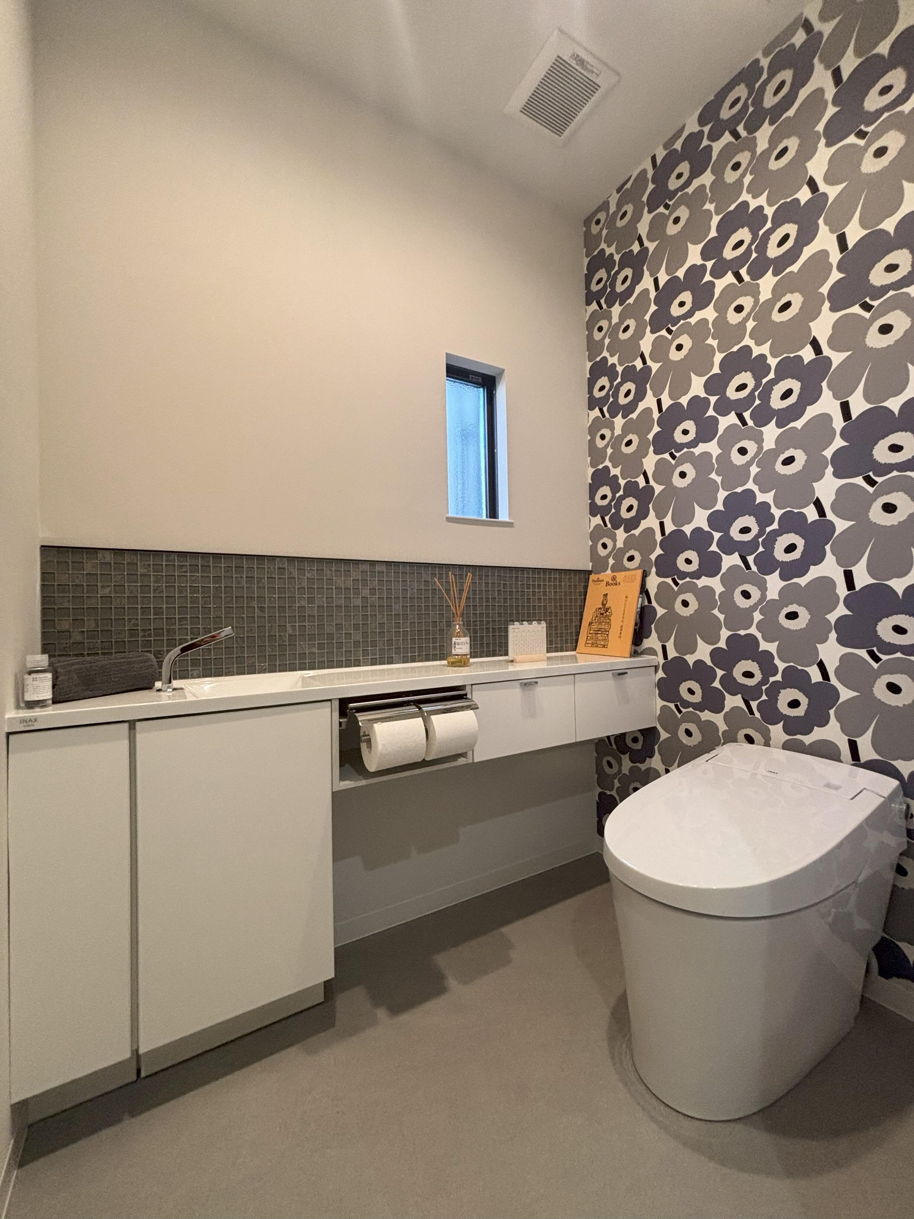 トイレの一面にマリメッコのクロスを採用。北欧デザインが映え、シンプルだった空間が一気に華やかに生まれ変わりました。また、便器の向きを90度回転し、奥行きを感じられる開放的なレイアウトに。