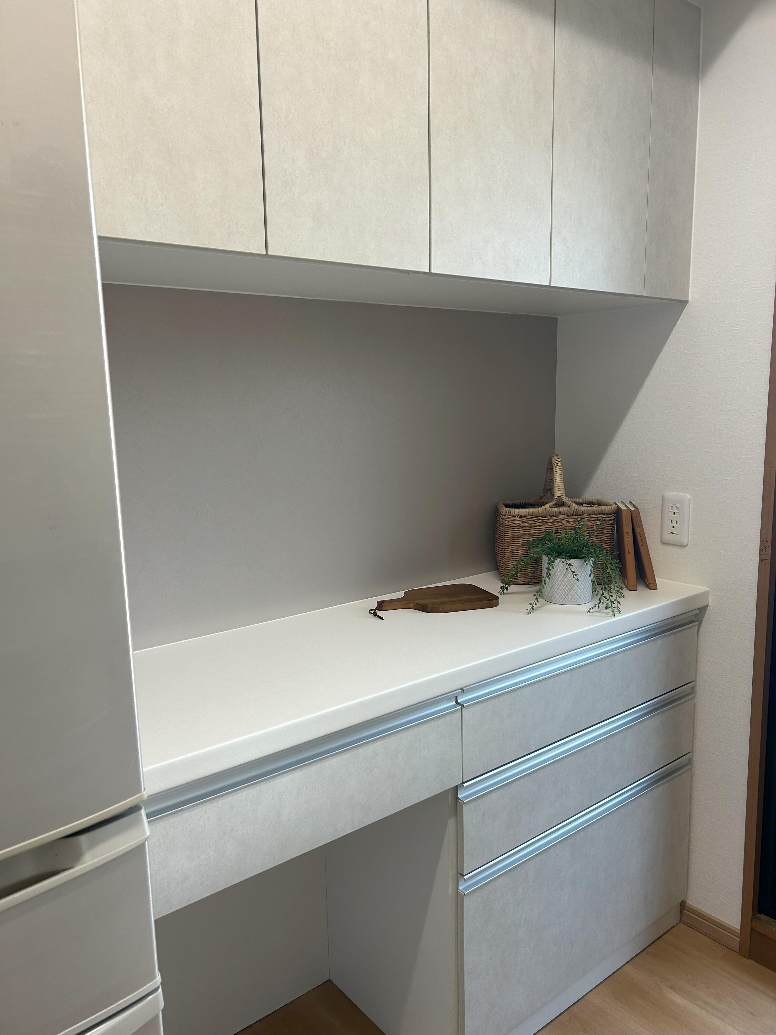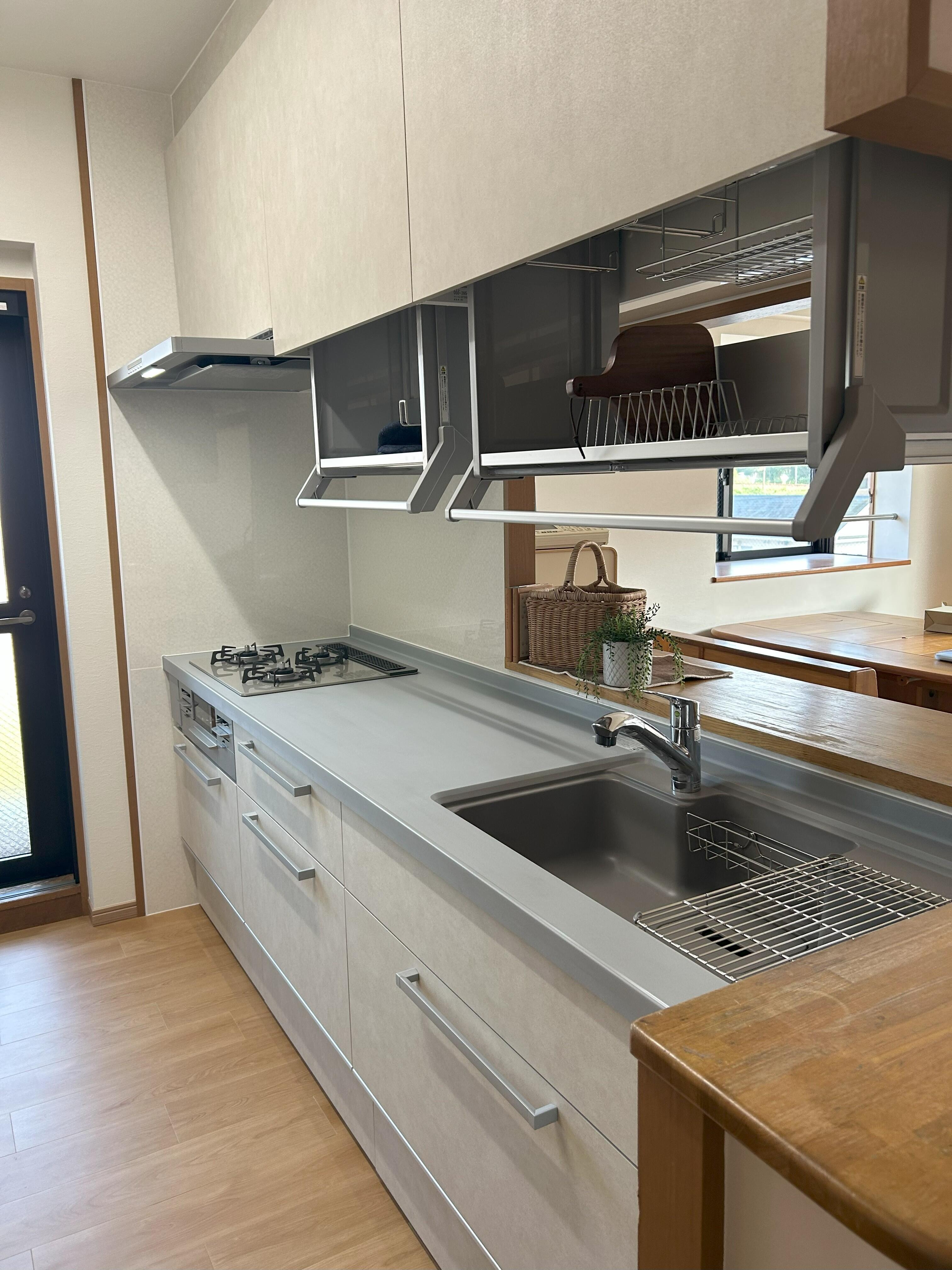LDKの改装にあたり、収納量が多く明るい雰囲気のキッチンをご希望でした。 収納量を確保しつつ、以前は手が届きにくかった吊り戸を昇降式に変更することで、物の出し入れがしやすく、使い勝手の良いキッチンになりました。