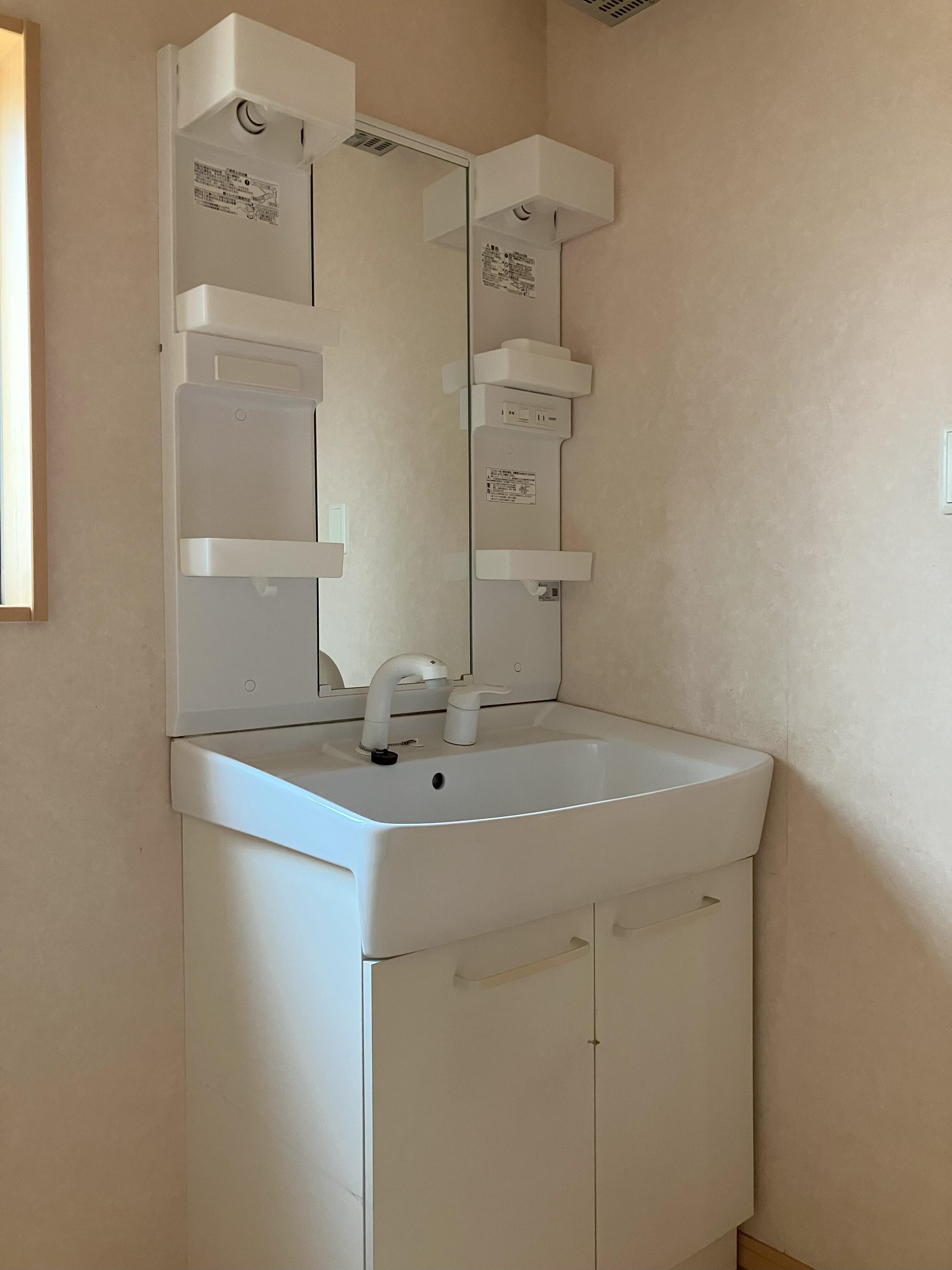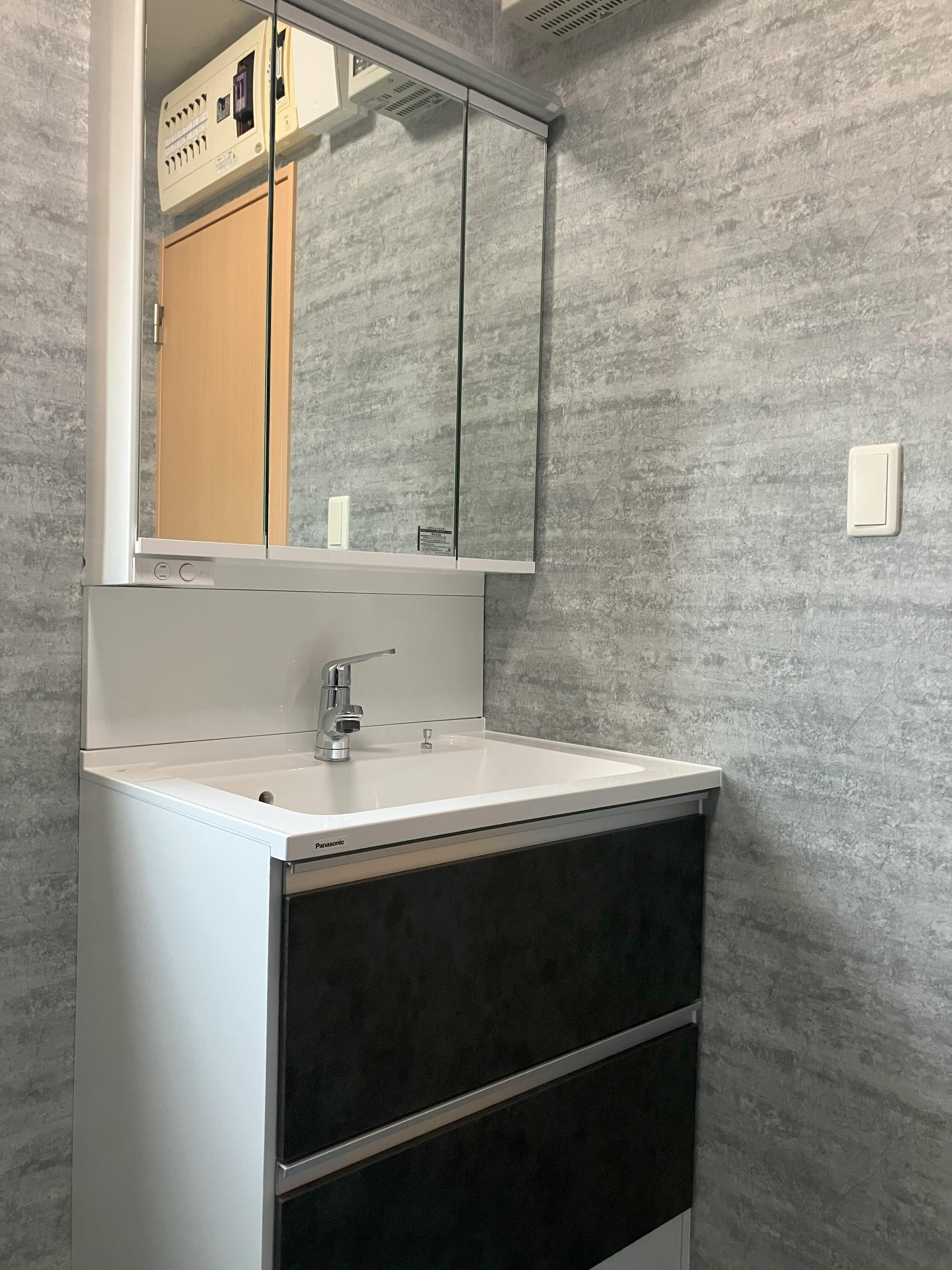 幅750mmの洗面化粧台を設置。 床にはブルーのフロアタイルを採用し、空間にデザイン性をプラスしました。 洗面室の中にもこだわりをたっぷり詰め込み、楽しい空間に仕上がっています。
